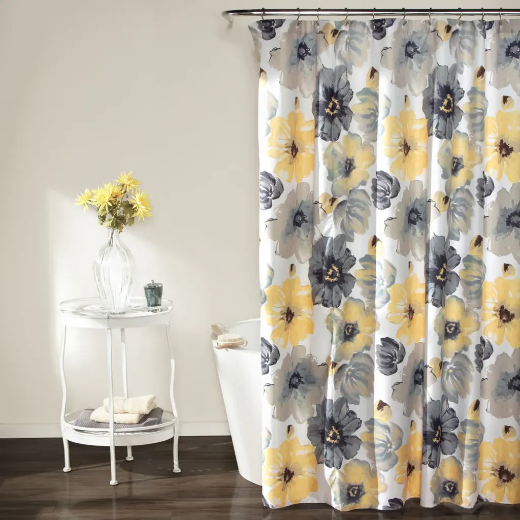 Add a cheerful and playful touch to your bathroom with this whimsical shower curtain. The bright yellow and grey flower design is sure to bring joy to your daily routine. Made from machine washable polyester for easy care, this shower curtain is both charming and practical.Features: