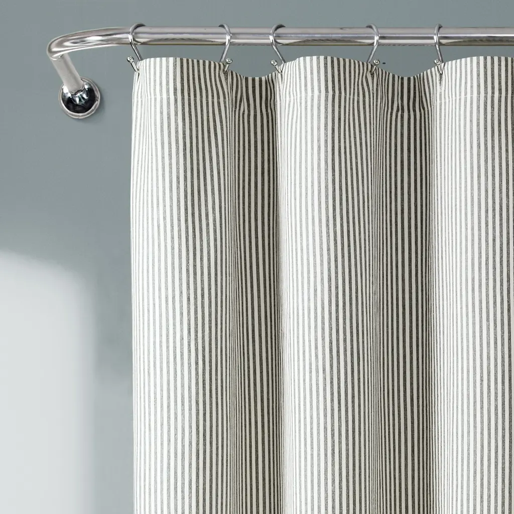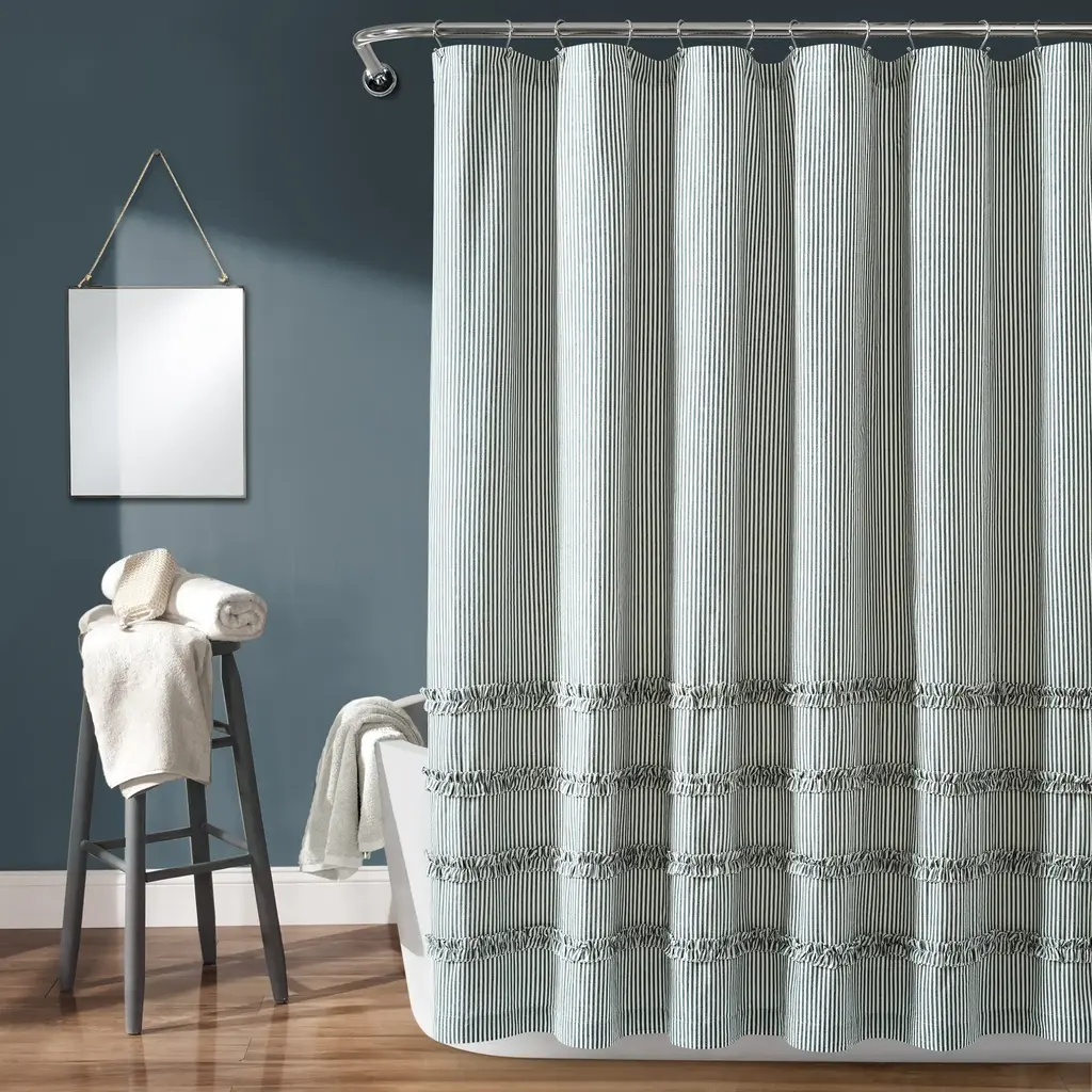 Offer retro country cottage glamour to your bathroom with this fun and fabulous curtain. The bold stripe is met with a ruffle detail for an expressive touch sure to enliven your lavatory. Made of soft, ruffled cotton, this shower curtain is machine washable for easy care.Features:
