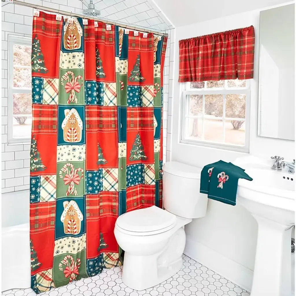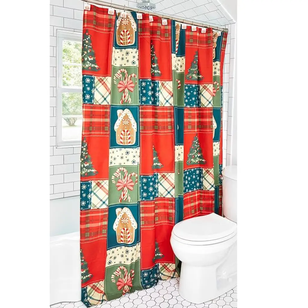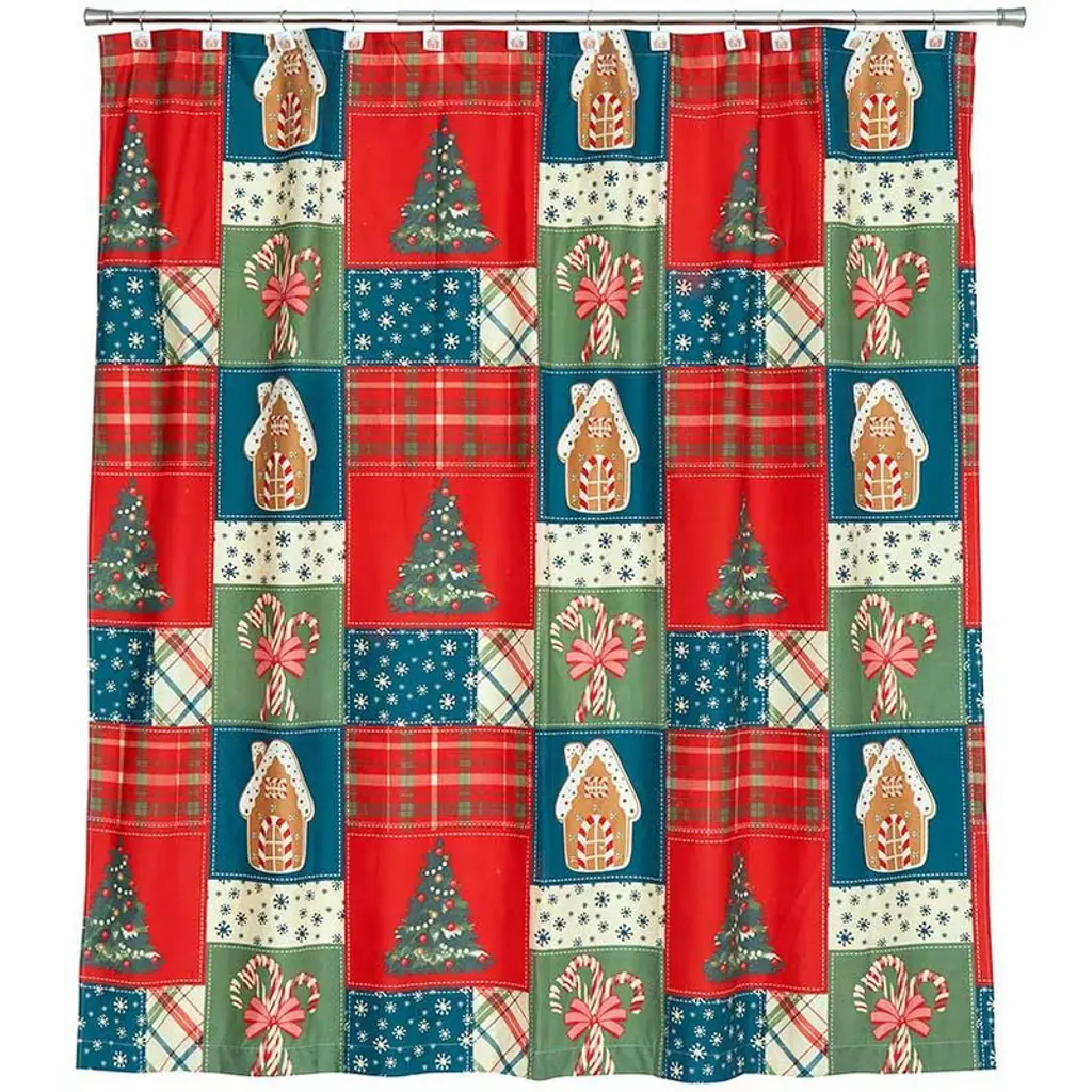 Transform your space into a sweet escape with the Gingerbread Patchwork Shower Curtain. Adorable design features red and green plaid, gingerbread houses and candy canes. 72" sq. Polyester Machine care Imported