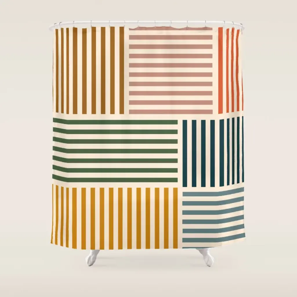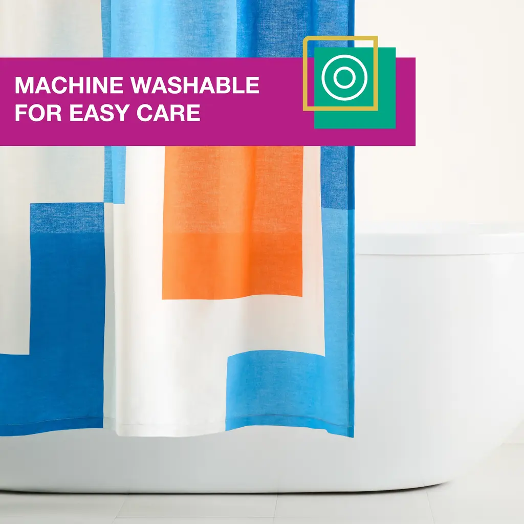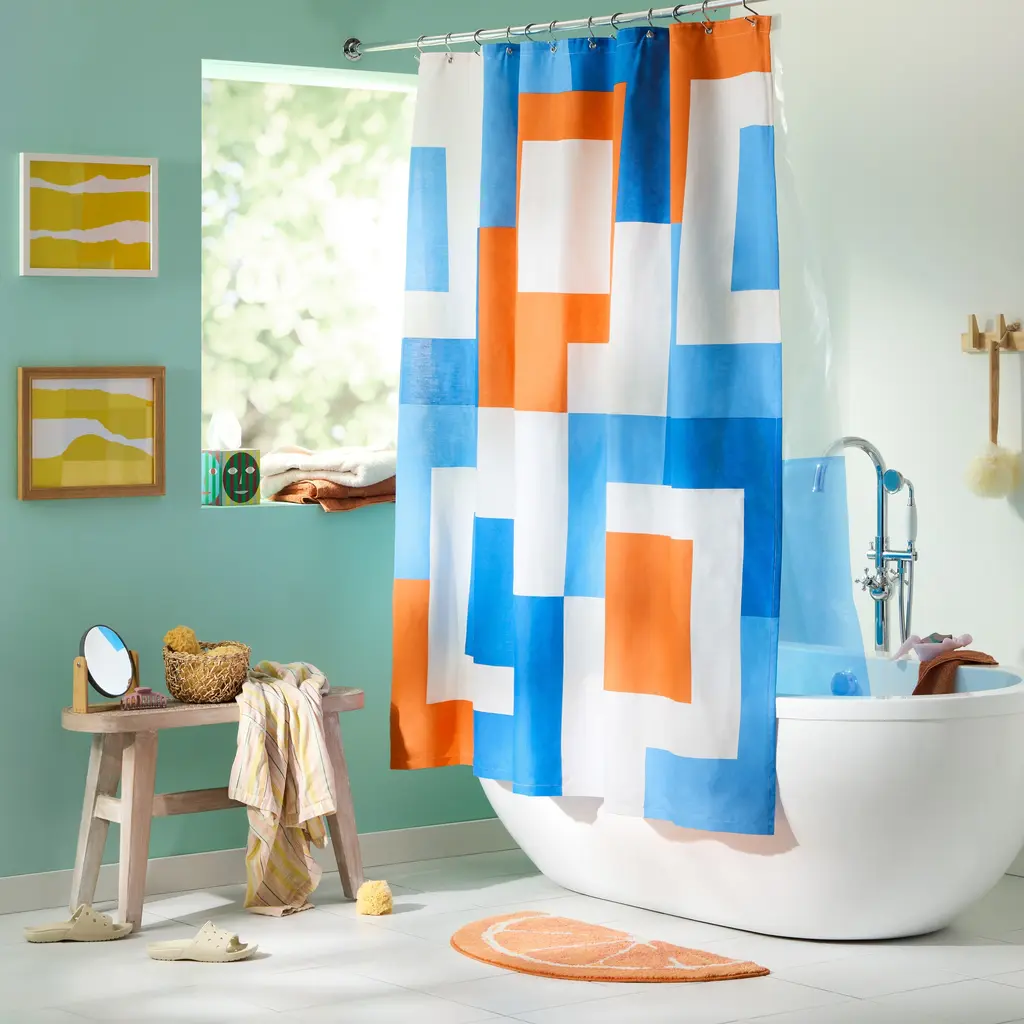 Go bold with your bathroom design by adding a Town & Country Play shower curtain into your space! With vibrant colors and a playful pattern, this Cotton-rich, fabric shower curtain will instantly transform any shower or bathroom. The Lucy Mid-Century Squares 70”x72” shower curtain offers a colorful, retro look with durability to last. Made with strong, reinforced top hem stitching and anti-rust grommets, this geometric shower curtain is ideal for busy households and kid’s bathrooms. Machine washable as needed for easy care. Use with waterproof shower liner recommended.