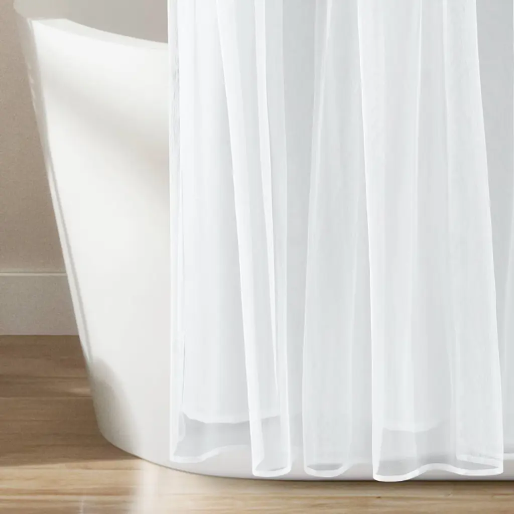 This shower curtain features a traditional and timeless color block style with the added elegance of tulle to give your bathroom a beautiful and chic makeover. This shower curtain offers a feminine frilly style that can be used in many home decor themes. Color blocking is always in style. This stylish shower curtain will add the perfect amount of flair to your bathroom, whether it be your master, guest or child's bath. The ruched tulle fabric is laid over microfiber, so you don't have to sacrifice privacy for style with this shower curtain. The shower curtain measures 72 inches square. It will hang easily with any standard shower curtain rings or hooks (sold separately). For your convenience, this shower curtain is safe to machine wash and hang dry. Please refer to the care label for full instructions
