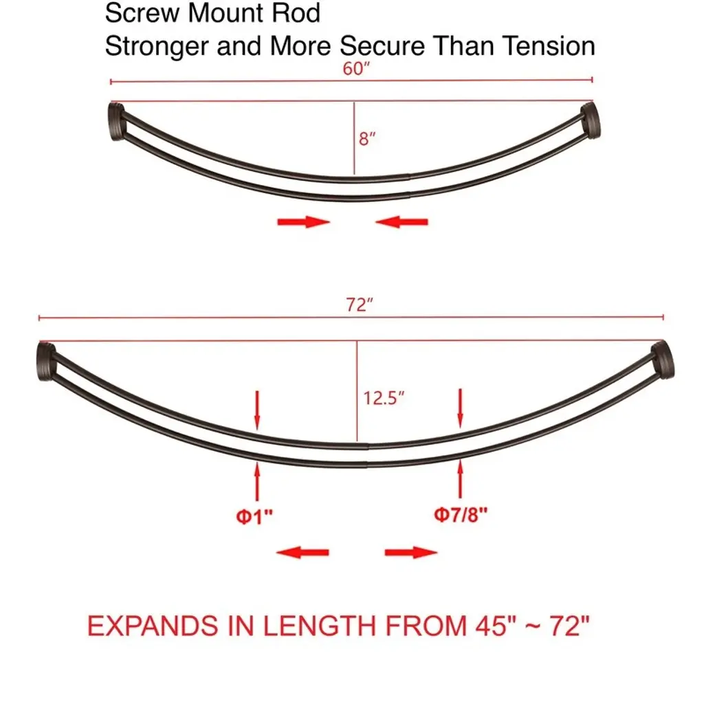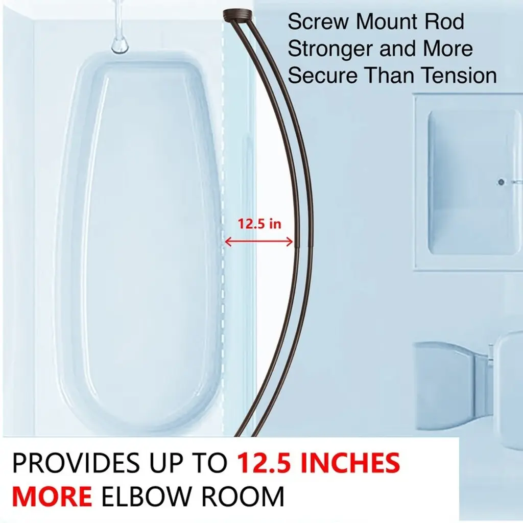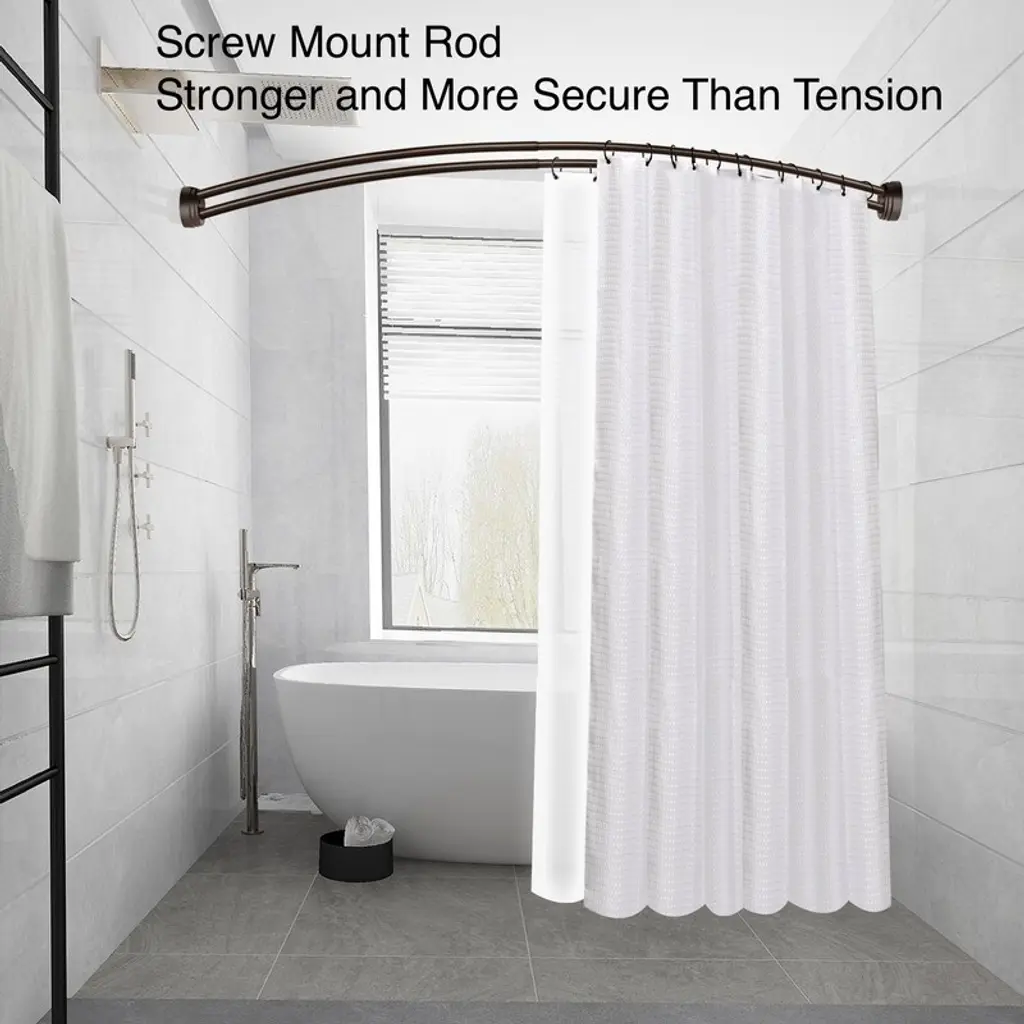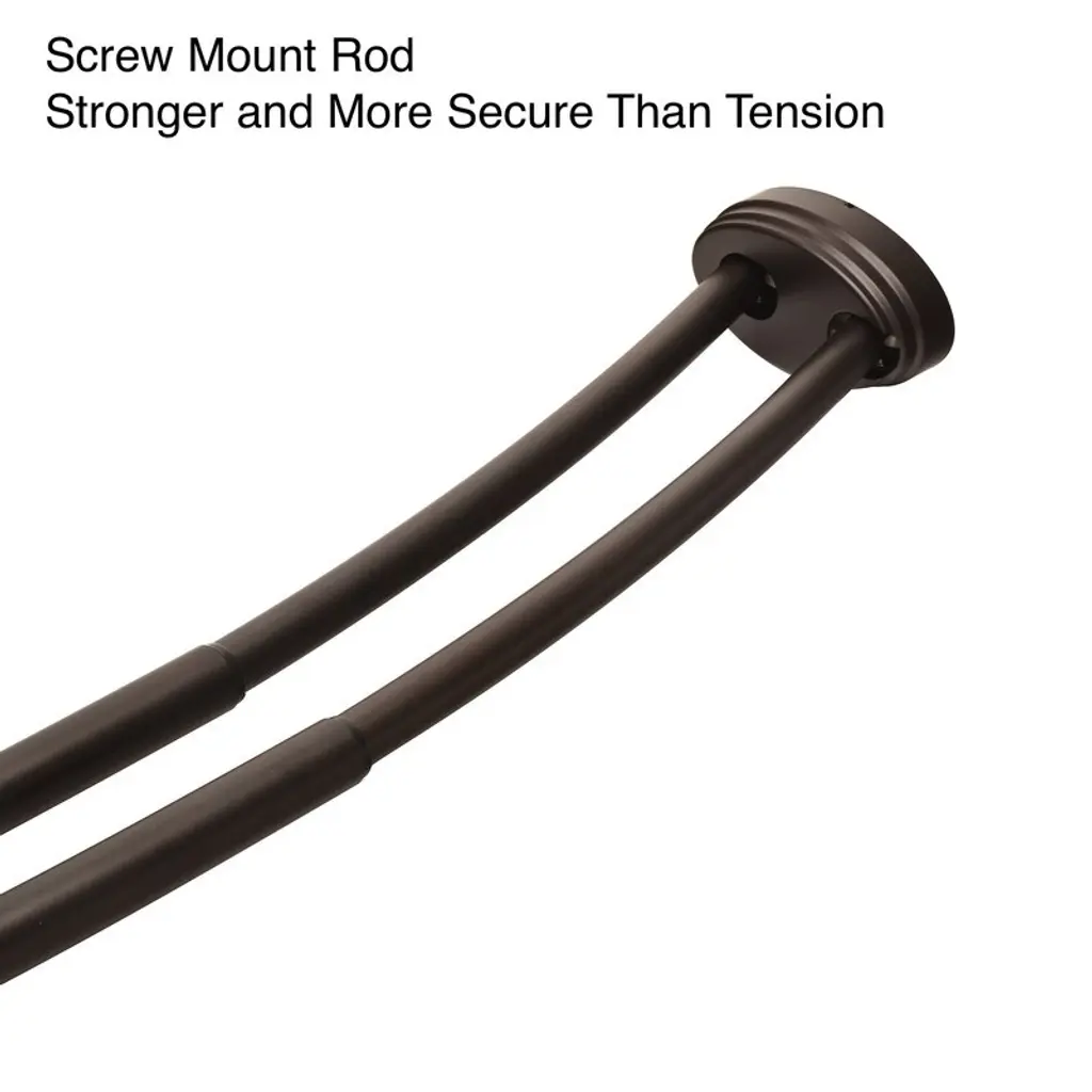 Securely mounts to the wall with screws. Product contains one 72" aluminum double curved rod, 24pcs shower hooks, one clear Shower Liner 71 x 71 Inch Upgrade your bathroom and create a serene shower space with Utopia Alley's double curved shower rods. It is perfect solution for showers of a variety of sizes. Expand and adjust to your specific bathroom layout. This shower rod curves around your tub to give you additional elbow room in your tub or shower and looks great too. Choose from an array of finishes to perfect match your decor. Made with 100% aluminum, guaranteed rust free for life! CURVED DESIGN: Provides extra elbow room in the shower. Drilling Required for installation. With two rods you can separate your shower liner and curtain. Additionally, if you choose to use the inner rod for both your liner and curtain you can use the outer rod to hang clothes and towels. This is the perfect choice for those looking to utilize more of their bathroom space. Size: 45" - 72" adjustable curved rod length. Fits standard 72" x 72" shower curtains. Its adaptable feature guarantees a precise fit in your bathroom space, providing an assurance of style and functionality. Elevate your bathroom's aesthetic with a shower rod that adjusts to your needs without sacrificing form or function. RUST-RESISTANT FINISH: Elevate your bathroom's decor with a rust-proof finish that adds sophistication and practicality. This shower rod's sleek design is resistant to rust and corrosion, ensuring it maintains its polished appearance for an extended period. Keep your space looking great for longer without worrying about water damage or stains on the shower rod. Enjoy the peace of mind that comes with having a stylish shower rod that can last for years to come. ABOUT US: UTOPIA ALLEY is a USA/woman-owned and operated business, you can shop with confidence for home decor, furniture bathroom accessories, and products with tailored needs. We believe in creating a stylish, comfortable space where you can relax, recharge, and feel inspired. Our products are expertly crafted to look visually beautiful, sophisticated, and constructed to last you for many years.