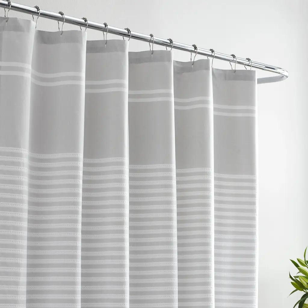 Update your bedroom with the modern Seersucker Stripe Shower Curtain by Vera Wang. Shower curtain measures 72"L x 70"W. 100% cotton and machine washable for easy care. 12 Evenly spaced buttonholes align on the top. Hooks and liner are not included.Dimensions: Shower Curtain: 72"Lx70"W