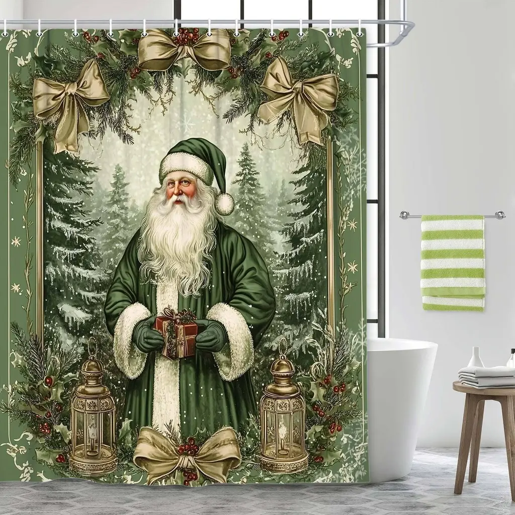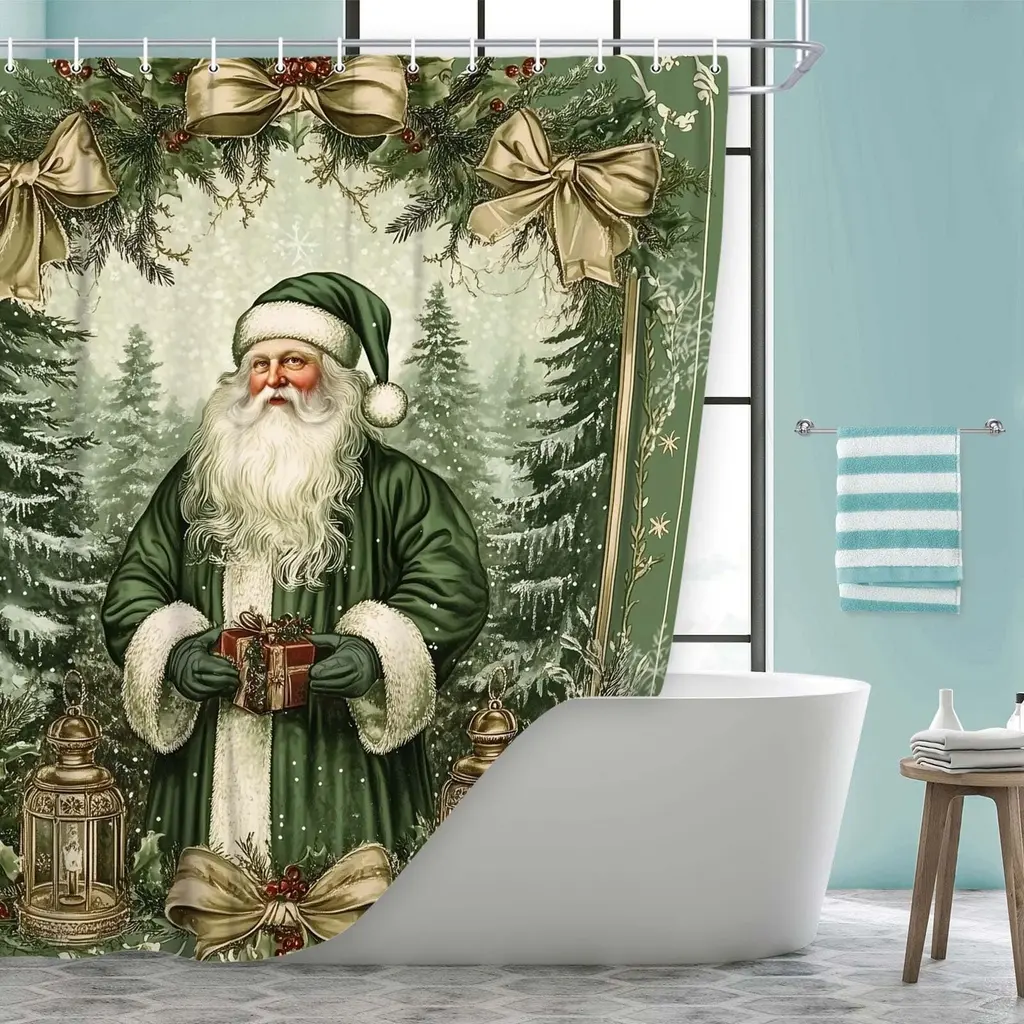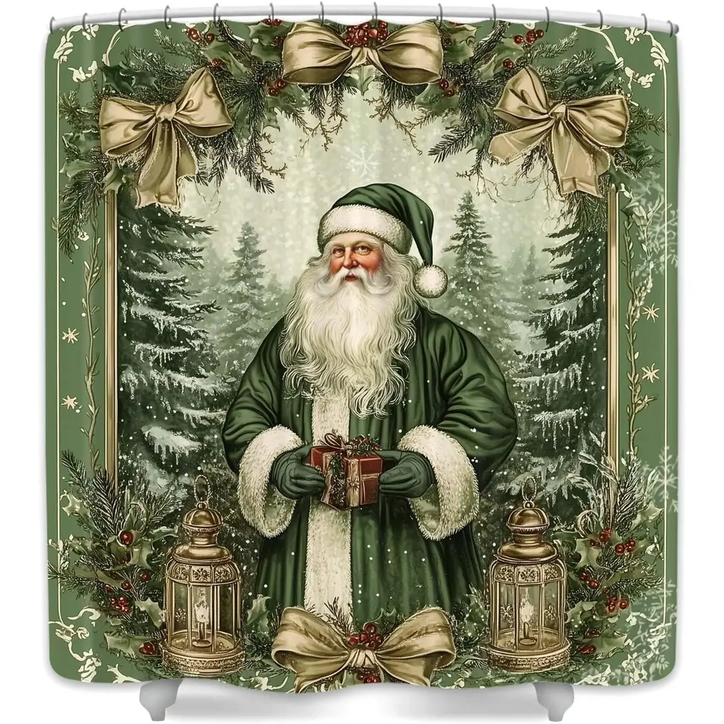 Vintage Christmas Shower Curtain Set - Retro Santa & Tree, 72x72 Inch - Multicolor