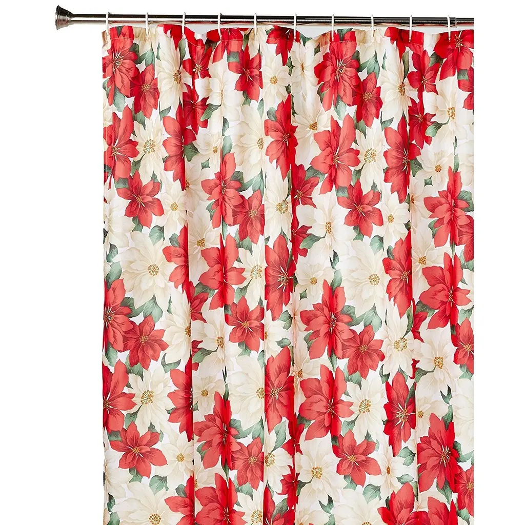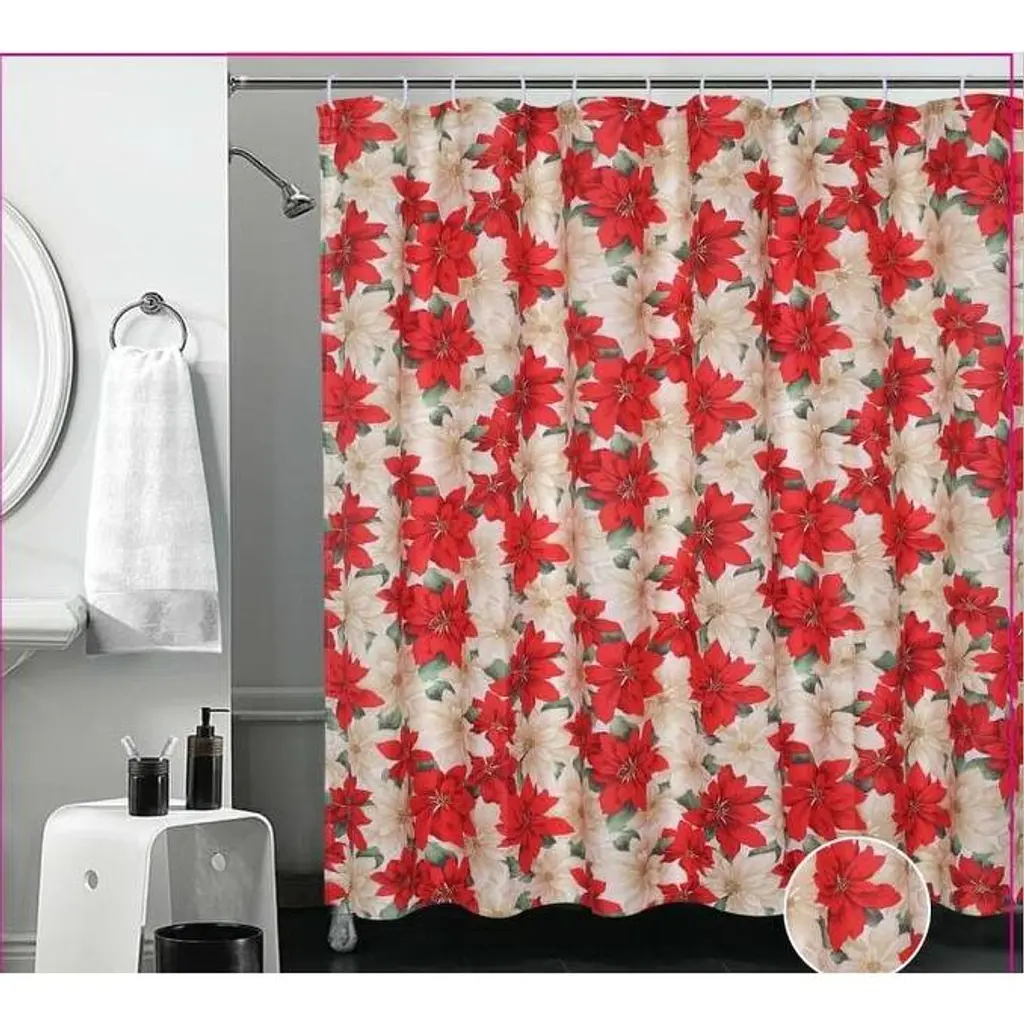 Why use a plain shower liner without any style? The festive poinsettia floral design shower curtain will enhance your bathroom with the richest Christmas decor. Update your bathroom with new shower curtains at an affordable price. Decorate your home with richness and style with this shower curtain, and augment the unique Christmas style of your bathroom in an instant! Having this shower curtain will add a touch of delight to your Christmas decor, and will bring new life to your home. The shower curtain is sure to add flavor, texture, and depth to your living space. Features an eye-catching festive poinsettia floral design that beautifully enhances any bathroom. This fresh contemporary design will surely brighten your bathroom. The edges are well sewn to protect the shower curtain from tearing, sewn reinforced holes for the rings. The 72" x 72" shower curtain is fade resistant and will retain the color much longer than cotton curtains. • 100% polyester, provides long lasting durability.• Quality, durability, decorative and festive.• 12 solid white hooks included.• Machine wash, on cold, Tumble dry on low.