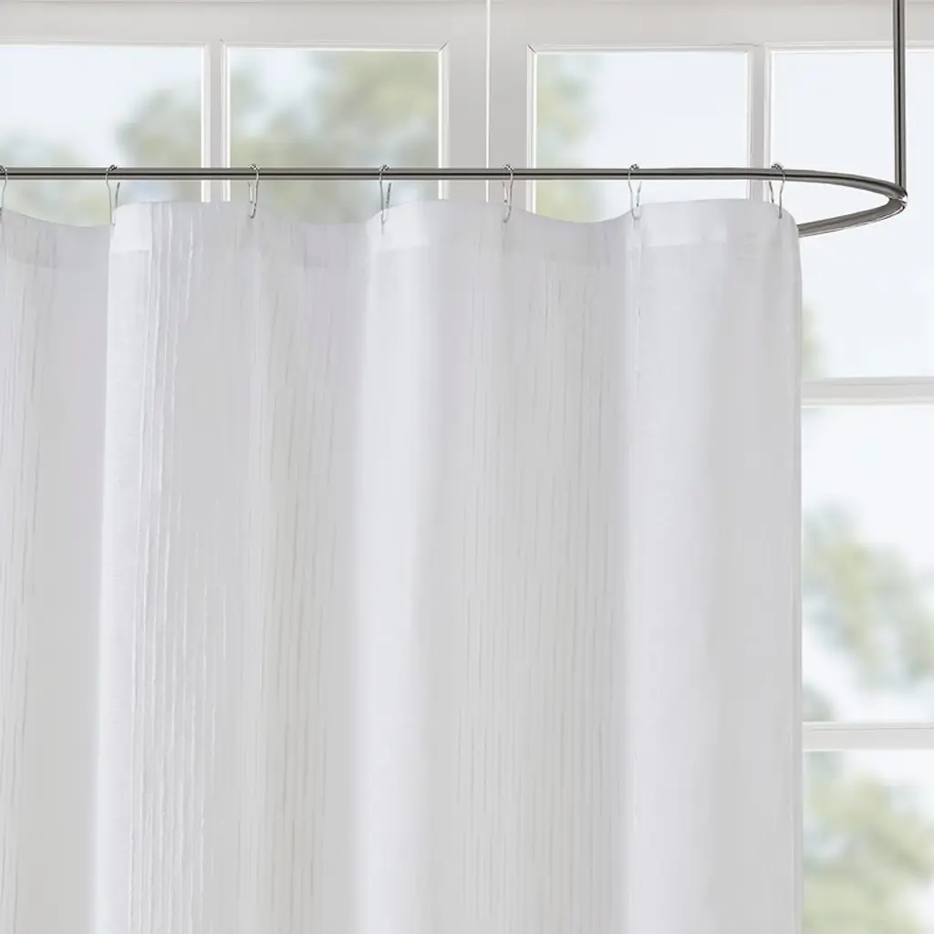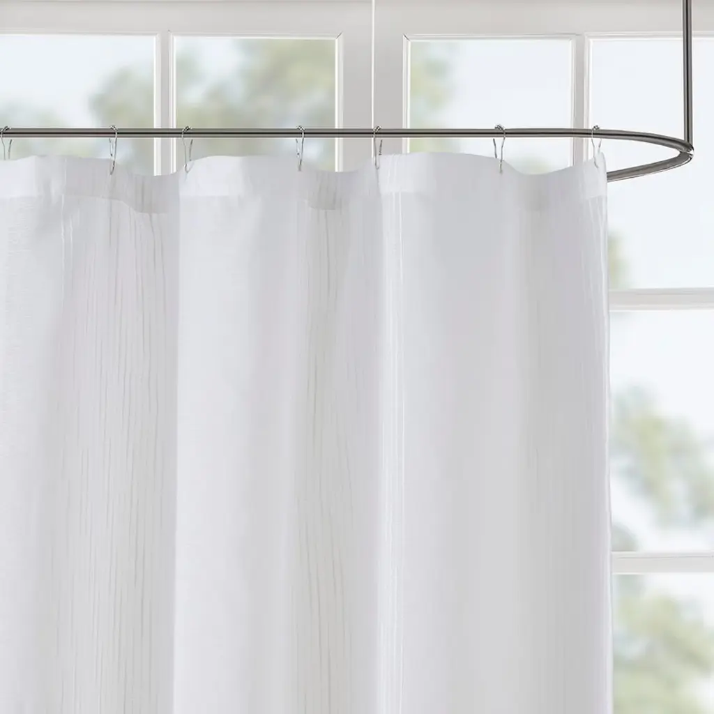Elevate your bathroom decor with the VYNXARIA Sheer Shower Curtain in classic white. Designed with a shabby chic striped sheer fabric, it boasts a light texture and a natural hand feel that brings a touch of warmth and elegance to your space. This curtain gently diffuses light, creating a tranquil atmosphere while ensuring privacy. Perfect for any style, it effortlessly enhances your bathroom's charm and sophistication, making it a must-have for a serene retreat!