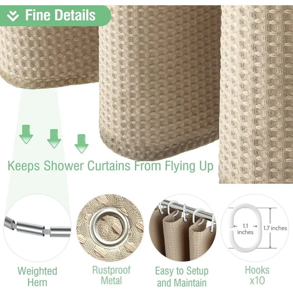 【Dimensions】54W * 72H inch; 256GSM (Gram Per Square Meter), about 1.1 pounds heavier than normal 90GSM fabric shower curtains; 10 rust-resistant grommets that fit most standard shower hooks or rings. Package includes 1 Sage Green Waffle Shower Curtain and 10 Plastic Hooks. And 🚿[Size] 48W*72H inches; 256GSM (grams per square meter), about 1.1 pounds heavier than ordinary 90GSM cloth shower curtains; 8 rust-proof grommets, suitable for most standard shower curtain hooks or shower curtain rings. The set contains 1 waffle shower curtain and 8 plastic hooks.🚿[THICK “COTTON” FABRIC SHOWER CURTAIN】Made of thick polyester fabric that has been professionally selected and tested to feel like cotton. The honeycomb waffle weave pattern adds elegance to your bathroom.So_1F6BF [Hotel Deluxe Spa Grade] “Triple Defense” fabric, ruffles are waterproof, oil-proof and stain-proof. Environmentally friendly and odorless. The hem is designed with heavy-duty counterweight, not easy to wrinkle, excellent light transmission and privacy.So_1F6BF [Elegant Modern Style This waffle shower curtain complements any bathroom - can be used in homes, apartments, condos, hotels, campers, RV's, dorms, school showers, college dorm rooms, athletic clubs, gyms, and anywhere else a reliable shower curtain is needed. Fabric fabric is machine washable and easy to care for.🚿[CUSTOMER SERVICE We are an integrated industry and trade company, dedicated to providing our customers with stylish and high quality products. If the item you receive is damaged in any way, we will replace it with a new one. If you have any questions about our products, please feel free to contact us.