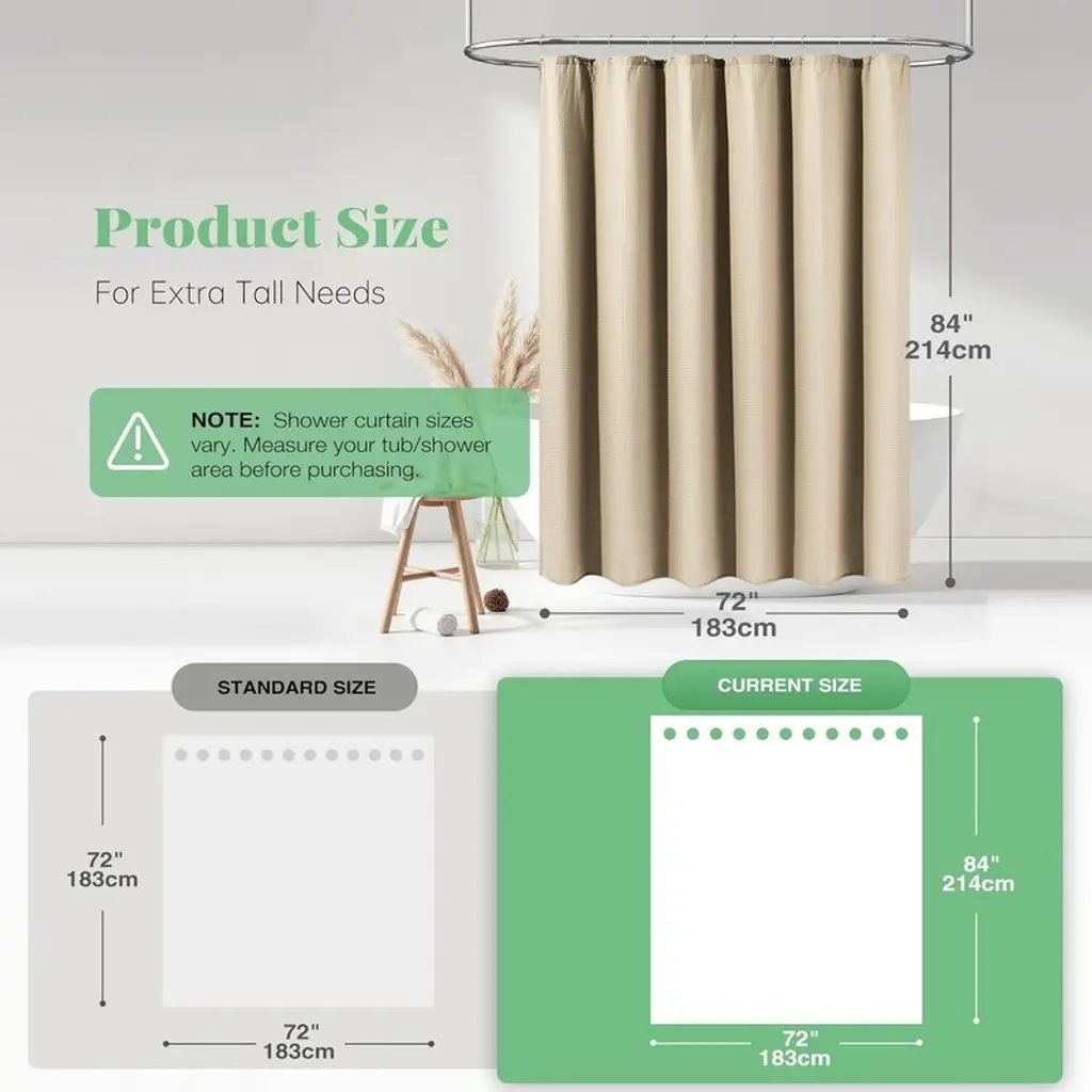 So_1F6BF [Size] 72 W * 84H inches; 256GSM (grams per square meter), about 1.1 pounds heavier than a regular 90GSM fabric shower curtain; 12 rust-resistant grommets, fits most standard shower hooks or rings. Package includes 1 waffle shower curtain and 12 plastic hooks.🚿[Heavyweight Thick “Cotton” Fabric Shower Curtain】Made of heavyweight polyester fabric that has been professionally selected and tested to feel like cotton. The honeycomb waffle weave pattern adds elegance to your bathroom.So_1F6BF [HOTEL LUXURY SPA GRADE] “Triple-proof” fabric, ruffles are waterproof, oil-proof and stain-proof. Environmentally friendly and odorless. The hem is designed with heavy-duty counterweight, not easy to wrinkle, excellent light transmission and privacy.So_1F6BF [Elegant and Neutral Style] This waffle shower curtain complements any bathroom - can be used in homes, apartments, condominiums, hotels, campers, RV's, dormitories, school showers, college dormitories, athletic clubs, gyms, and anywhere else a reliable shower curtain is needed. Fabric fabric is machine washable and easy to care for.So_1F6BF [CUSTOMER SERVICE] We are an integrated company of industry and trade, dedicated to providing our customers with fashionable and high-quality products. If you receive any damaged item, we will replace it with a new one for you. If you have any questions about our products, please feel free to contact us.