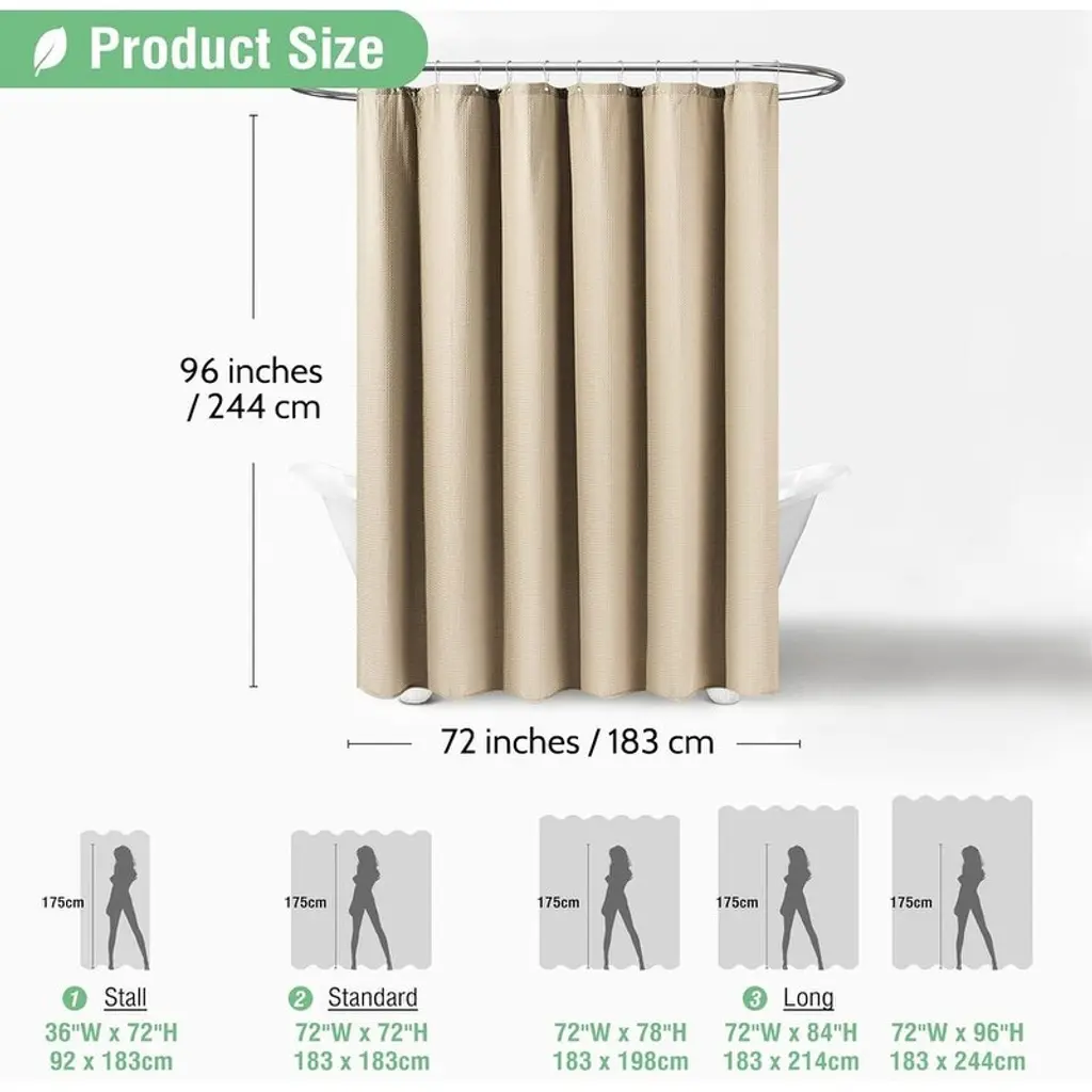 So_1F6BF [Size] 72 W * 96H inches; 256GSM (grams per square meter), about 1.1 pounds heavier than a regular 90GSM fabric shower curtain; 12 rust-resistant grommets, fits most standard shower hooks or rings. Package includes 1 waffle shower curtain and 12 plastic hooks.🚿[Heavyweight Thick “Cotton” Fabric Shower Curtain】Made of heavyweight polyester fabric that has been professionally selected and tested to feel like cotton. The honeycomb waffle weave pattern adds elegance to your bathroom.So_1F6BF [HOTEL LUXURY SPA GRADE] “Triple-proof” fabric, ruffles are waterproof, oil-proof and stain-proof. Environmentally friendly and odorless. The hem is designed with heavy-duty counterweight, not easy to wrinkle, excellent light transmission and privacy.So_1F6BF [Elegant and Neutral Style] This waffle shower curtain complements any bathroom - can be used in homes, apartments, condominiums, hotels, campers, RV's, dormitories, school showers, college dormitories, athletic clubs, gyms, and anywhere else a reliable shower curtain is needed. Fabric fabric is machine washable and easy to care for.So_1F6BF [CUSTOMER SERVICE] We are an integrated company of industry and trade, dedicated to providing our customers with fashionable and high-quality products. If you receive any damaged item, we will replace it with a new one for you. If you have any questions about our products, please feel free to contact us.