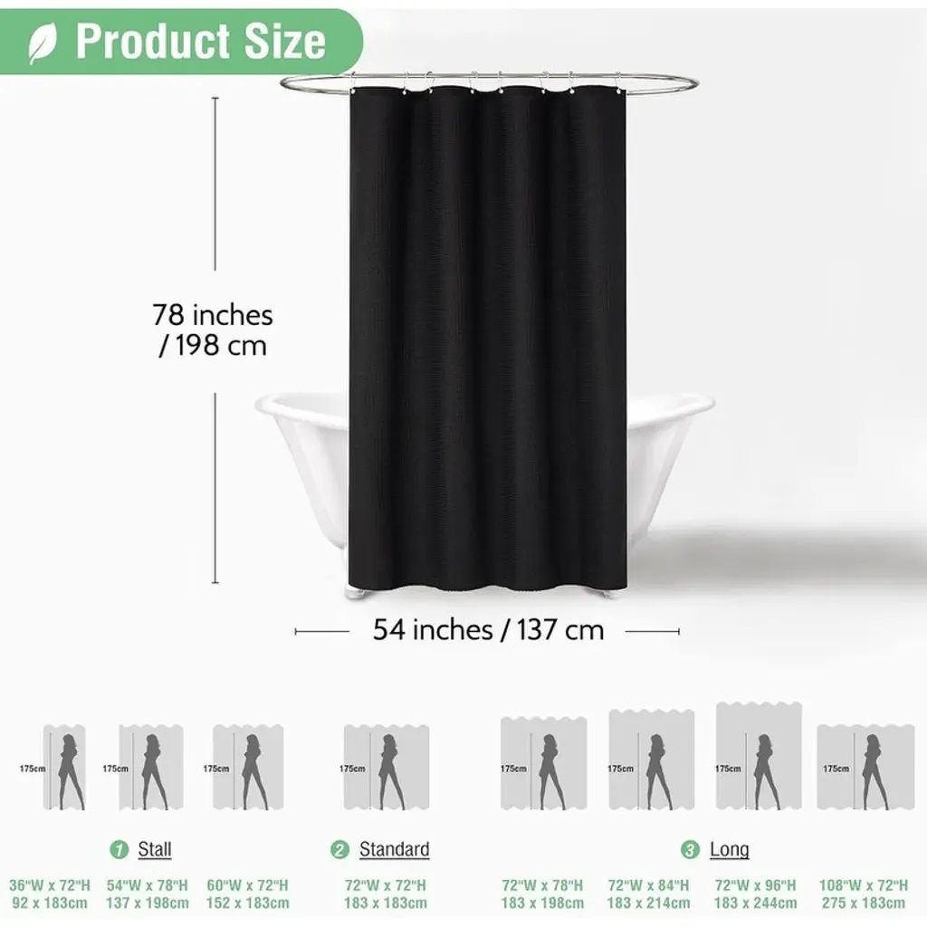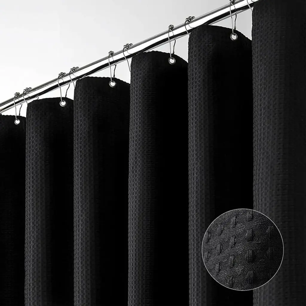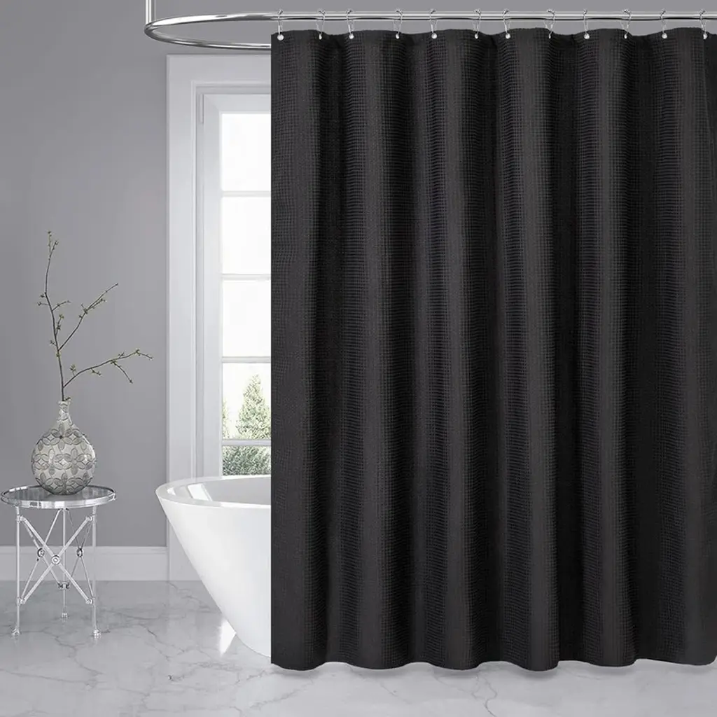 Waffle Textured Heavy Duty Thick Fabric Shower Curtain, Luxury Weighted Polyester Fabric Shower Curtain Set - Black