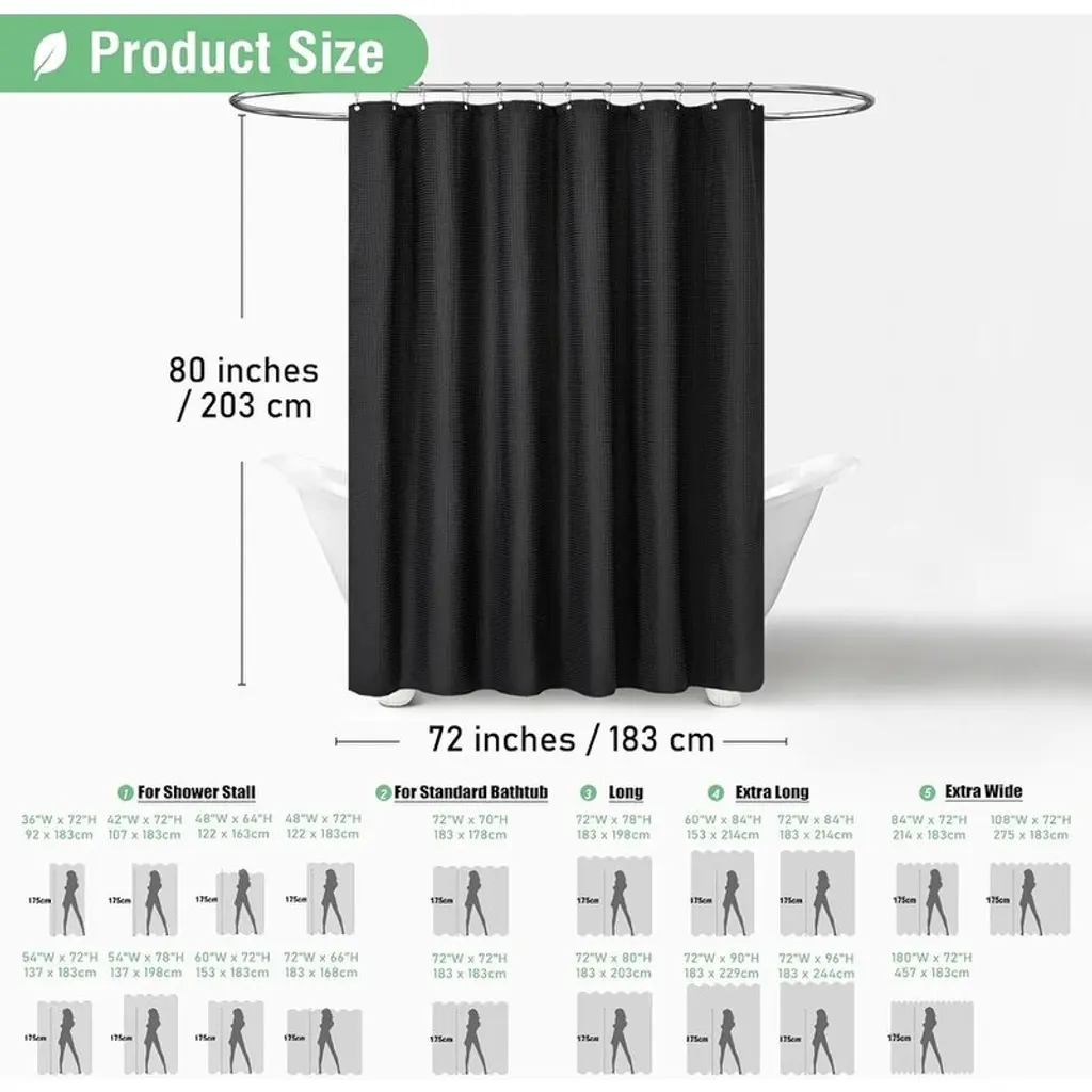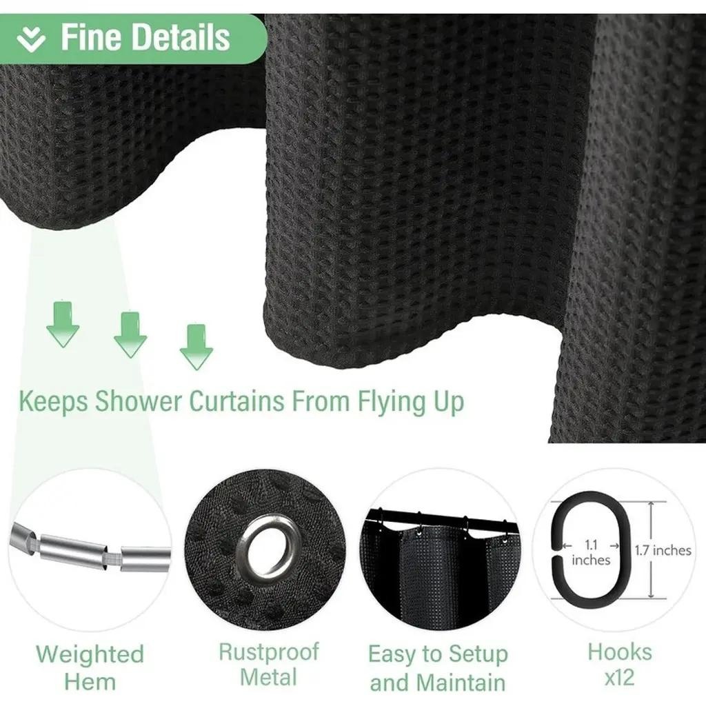 Waffle Textured Heavy Duty Thick Fabric Shower Curtain, Luxury Weighted Polyester Fabric Shower Curtain Set - Black