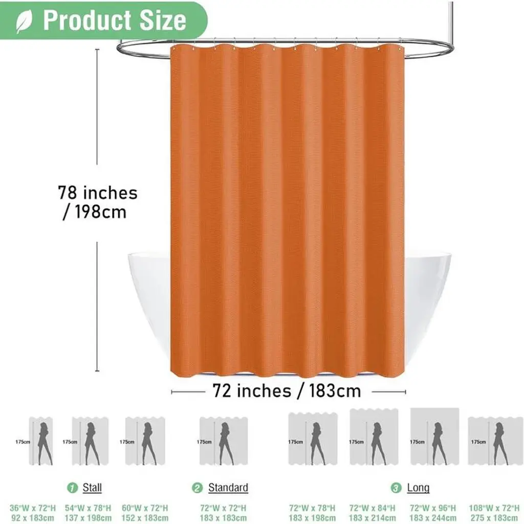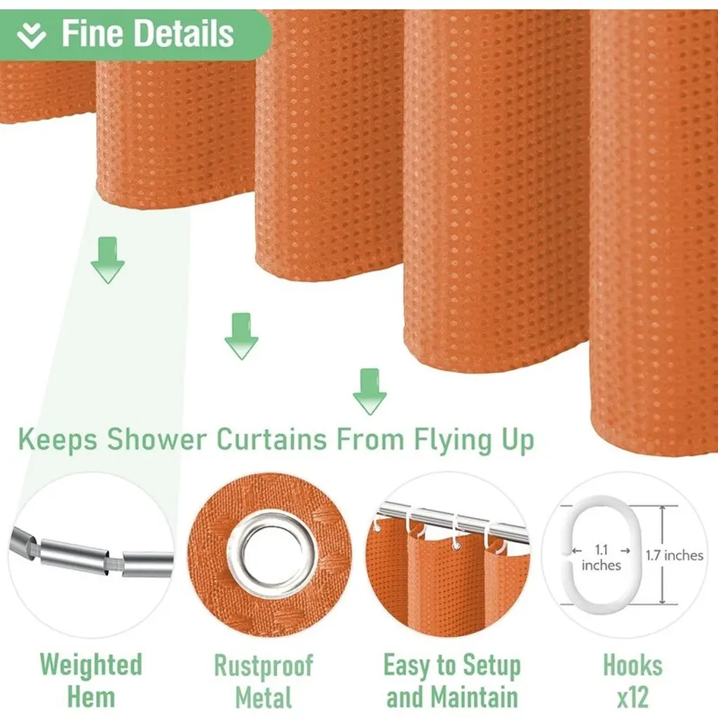 🚿[THICK “COTTON” FABRIC SHOWER CURTAIN】Made of thick polyester fabric that has been professionally selected and tested to feel like cotton. The honeycomb waffle weave pattern adds elegance to your bathroom.So_1F6BF [Hotel Deluxe Spa Grade] “Triple Defense” fabric, ruffles are waterproof, oil-proof and stain-proof. Environmentally friendly and odorless. The hem is designed with heavy-duty counterweight, not easy to wrinkle, excellent light transmission and privacy.So_1F6BF [Elegant Modern Style This waffle shower curtain complements any bathroom - can be used in homes, apartments, condos, hotels, campers, RV's, dorms, school showers, college dorm rooms, athletic clubs, gyms, and anywhere else a reliable shower curtain is needed. Fabric fabric is machine washable and easy to care for.🚿[CUSTOMER SERVICE We are an integrated industry and trade company, dedicated to providing our customers with stylish and high quality products. If the item you receive is damaged in any way, we will replace it with a new one. If you have any questions about our products, please feel free to contact us.