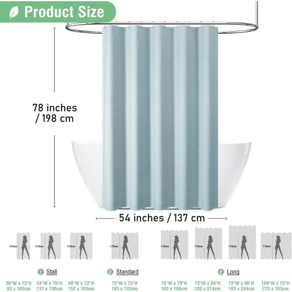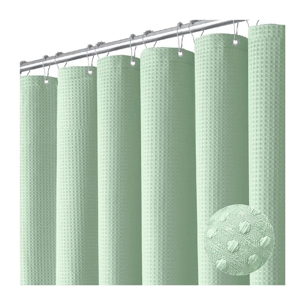 🚿【Dimensions】54W * 78H inch; 256GSM (Gram Per Square Meter), about 1.1 pounds heavier than normal 90GSM fabric shower curtains; 10 rust-resistant grommets that fit most standard shower hooks or rings. Package includes 1 Sage Green Waffle Shower Curtain and 10 Plastic Hooks.🚿[THICK “COTTON” FABRIC SHOWER CURTAIN】Made of thick polyester fabric that has been professionally selected and tested to feel like cotton. The honeycomb waffle weave pattern adds elegance to your bathroom.So_1F6BF [Hotel Deluxe Spa Grade] “Triple Defense” fabric, ruffles are waterproof, oil-proof and stain-proof. Environmentally friendly and odorless. The hem is designed with heavy-duty counterweight, not easy to wrinkle, excellent light transmission and privacy.So_1F6BF [Elegant Modern Style This waffle shower curtain complements any bathroom - can be used in homes, apartments, condos, hotels, campers, RV's, dorms, school showers, college dorm rooms, athletic clubs, gyms, and anywhere else a reliable shower curtain is needed. Fabric fabric is machine washable and easy to care for.🚿[CUSTOMER SERVICE We are an integrated industry and trade company, dedicated to providing our customers with stylish and high quality products. If the item you receive is damaged in any way, we will replace it with a new one. If you have any questions about our products, please feel free to contact us.