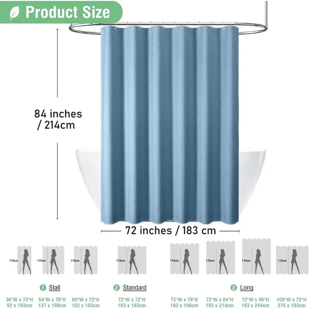 So_1F6BF [Size] 72 W * 84H inches; 256GSM (grams per square meter), about 1.1 pounds heavier than a regular 90GSM fabric shower curtain; 12 rust-resistant grommets, fits most standard shower hooks or rings. Package includes 1 waffle shower curtain and 12 plastic hooks.So_1F6BF [Heavyweight Thick “Cotton” Fabric Shower Curtain] Made of heavyweight polyester fabric that has been professionally selected and tested to feel like cotton. The honeycomb waffle weave pattern adds elegance to your bathroom.So_1F6BF [HOTEL LUXURY SPA GRADE] “Triple-proof” fabric, ruffles are waterproof, oil-proof and stain-proof. Environmentally friendly and odorless. The hem is designed with heavy-duty counterweight, not easy to wrinkle, excellent light transmission and privacy.So_1F6BF [Elegant and Neutral Style] This waffle shower curtain complements any bathroom - can be used in homes, apartments, condominiums, hotels, campers, RV's, dormitories, school showers, college dormitories, athletic clubs, gyms, and anywhere else a reliable shower curtain is needed. Fabric fabric is machine washable and easy to care for.So_1F6BF [CUSTOMER SERVICE] We are an integrated company of industry and trade, dedicated to providing our customers with fashionable and high-quality products. If you receive any damaged item, we will replace it with a new one for you. If you have any questions about our products, please feel free to contact us.