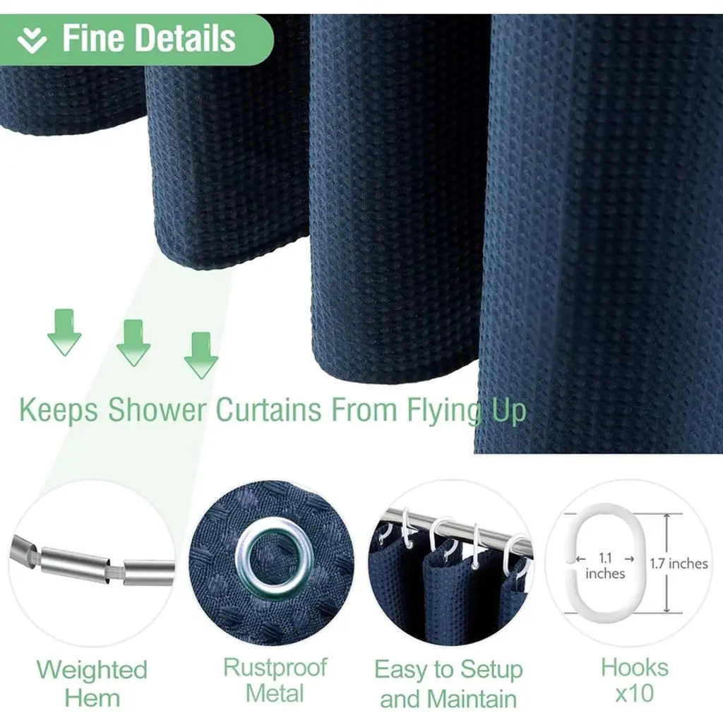 Waffle Textured Heavy Duty Thick Fabric Shower Curtain, Luxury Weighted Polyester Fabric Shower Curtain Set - Navy Blue