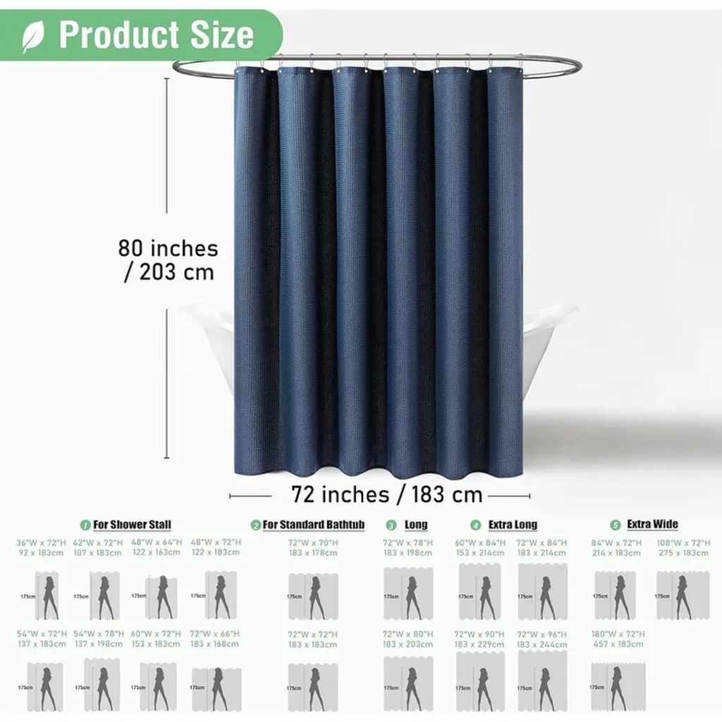 So_1F6BF [Size] 72 W * 80H inch (183W * 205Hcm); 256GSM (grams per square meter), about 1.1 pounds heavier than a regular 90GSM fabric shower curtain; 12 rust-resistant grommets, fits most standard shower hooks or rings. Package includes 1 waffle shower curtain and 12 plastic hooks.🚿[THICK “COTTON” FABRIC SHOWER CURTAIN】Made of thick polyester fabric that has been professionally selected and tested to feel like cotton. The honeycomb waffle weave pattern adds elegance to your bathroom.So_1F6BF [Hotel Deluxe Spa Grade] “Triple Defense” fabric, ruffles are waterproof, oil-proof and stain-proof. Environmentally friendly and odorless. The hem is designed with heavy duty counterweight, not easy to wrinkle, excellent light transmission and privacy.🚿[ELEGANT MODERN STYLE] This waffle shower curtain complements any bathroom - can be used in homes, apartments, condominiums, hotels, campers, RV's, dormitories, school showers, college dormitories, athletic clubs, gyms, and anywhere else you need a reliable shower curtain. Fabric fabric is machine washable and easy to care for.So_1F6BF [CUSTOMER SERVICE] We are an integrated company of industry and trade, dedicated to providing our customers with fashionable and high-quality products. If you receive any damaged item, we will replace it with a new one for you. If you have any questions about our products, please feel free to contact us.