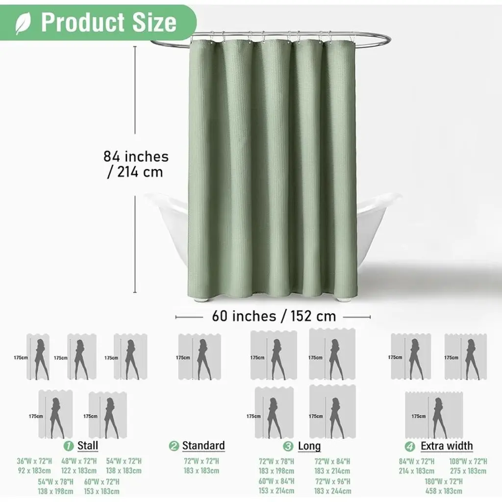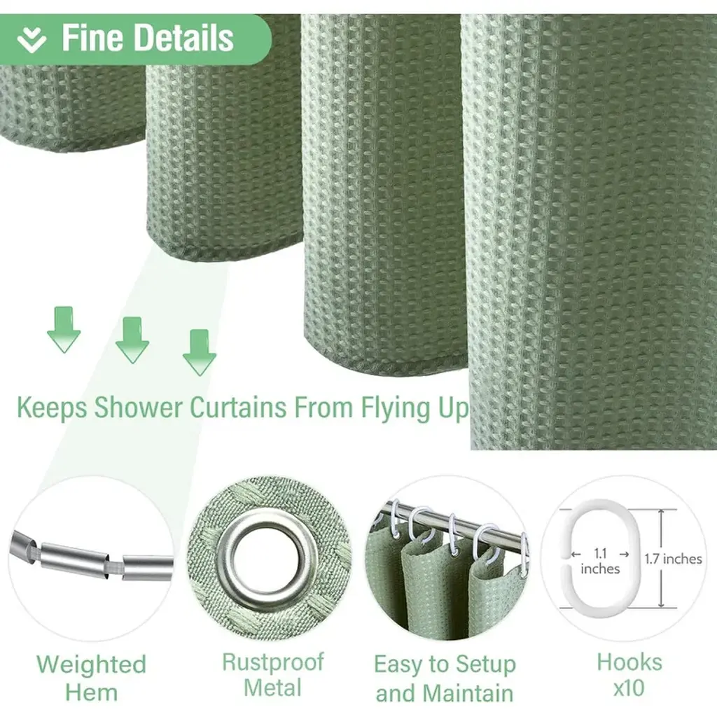 Waffle Textured Heavy Duty Thick Fabric Shower Curtain, Luxury Weighted Polyester Fabric Shower Curtain Set - Sage Green