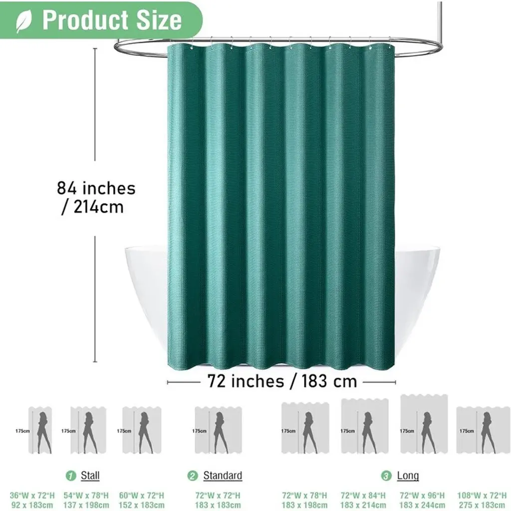 So_1F6BF [Size] 72 W * 84H inches; 256GSM (grams per square meter), about 1.1 pounds heavier than a regular 90GSM fabric shower curtain; 12 rust-resistant grommets, fits most standard shower hooks or rings. Package includes 1 waffle shower curtain and 12 plastic hooks.So_1F6BF [Heavyweight Thick “Cotton” Fabric Shower Curtain] Made of heavyweight polyester fabric that has been professionally selected and tested to feel like cotton. The honeycomb waffle weave pattern adds elegance to your bathroom.So_1F6BF [HOTEL LUXURY SPA GRADE] “Triple-proof” fabric, ruffles are waterproof, oil-proof and stain-proof. Environmentally friendly and odorless. The hem is designed with heavy-duty counterweight, not easy to wrinkle, excellent light transmission and privacy.So_1F6BF [Elegant and Neutral Style] This waffle shower curtain complements any bathroom - can be used in homes, apartments, condominiums, hotels, campers, RV's, dormitories, school showers, college dormitories, athletic clubs, gyms, and anywhere else a reliable shower curtain is needed. Fabric fabric is machine washable and easy to care for.So_1F6BF [CUSTOMER SERVICE] We are an integrated company of industry and trade, dedicated to providing our customers with fashionable and high-quality products. If you receive any damaged item, we will replace it with a new one for you. If you have any questions about our products, please feel free to contact us.