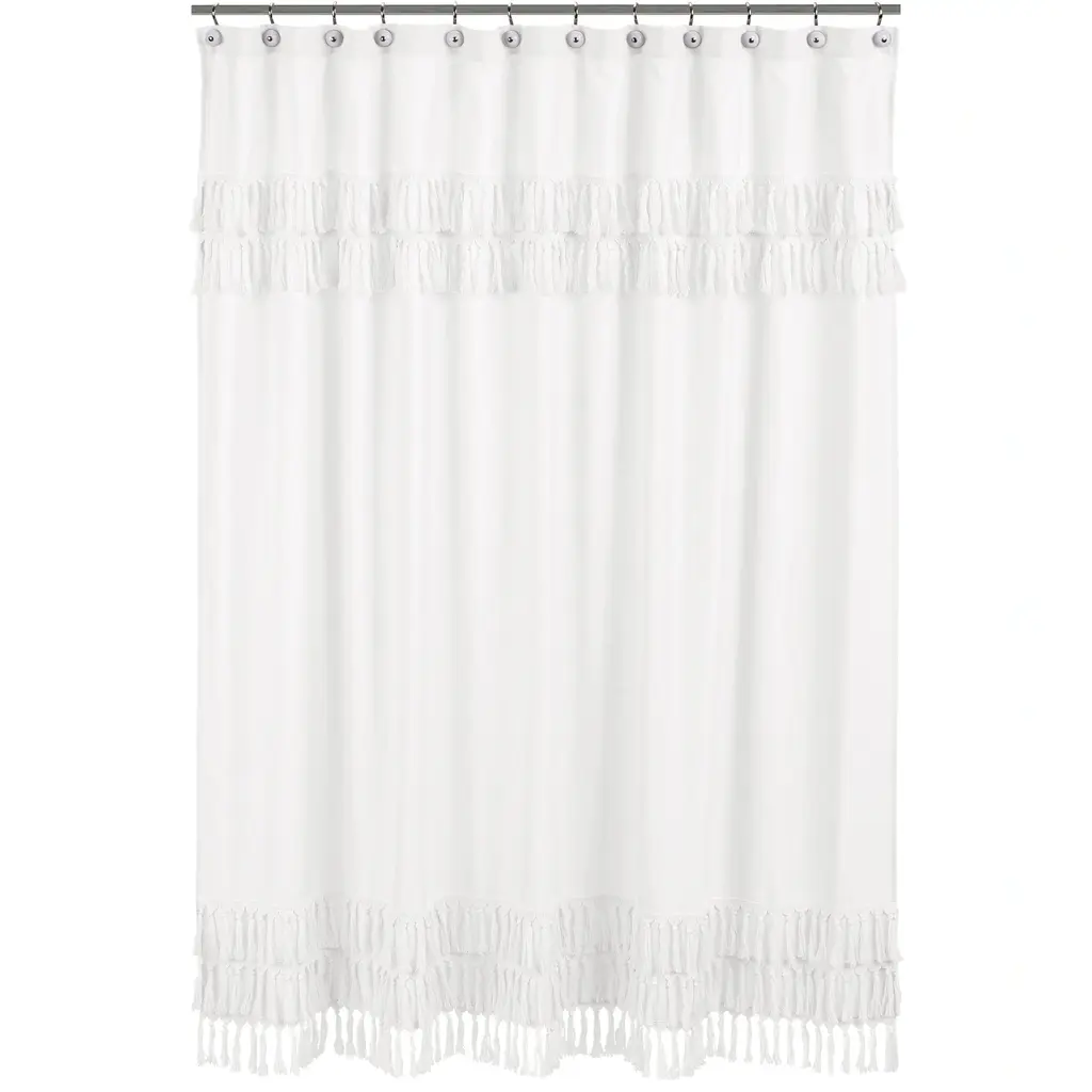 White Boho Bohemian Bathroom Fabric Bath Shower Curtain - Solid Shabby Chic Princess Luxurious Luxury Elegant Tassel Fringe - White