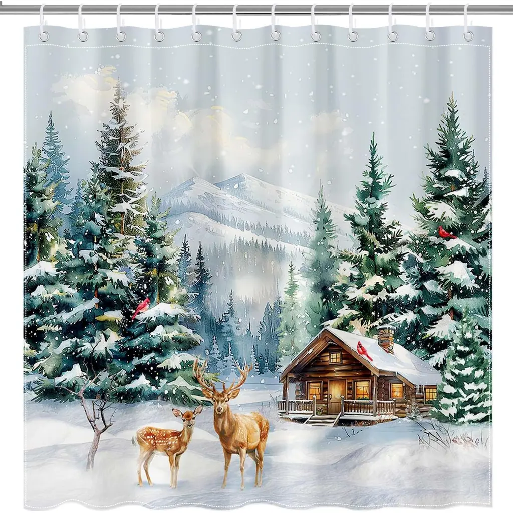 Winter Forest Deer Shower Curtain - Rustic Pine Tree Decor, 72x72 Inch - Multicolor