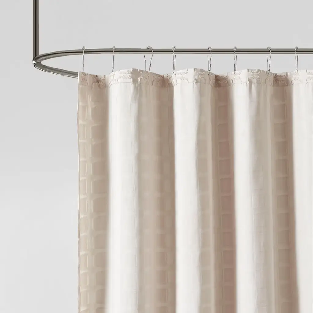 Elevate your bathroom decor with the Madison Park Metro Woven Clipped Solid Shower Curtain. This solid sand color shower curtain features a woven square geometric design with a clipped treatment to create beautiful texture and dimension, for an updated look. Measuring 72¡±x72¡±, this shower curtain adds a chic modern touch to your bathroom and is machine washable for easy care. A water repellant liner is not included, but highly recommended and can be purchased separately.Product Details72x72"1 Shower Curtain:72"W x 72"LMaterial100% Polyester