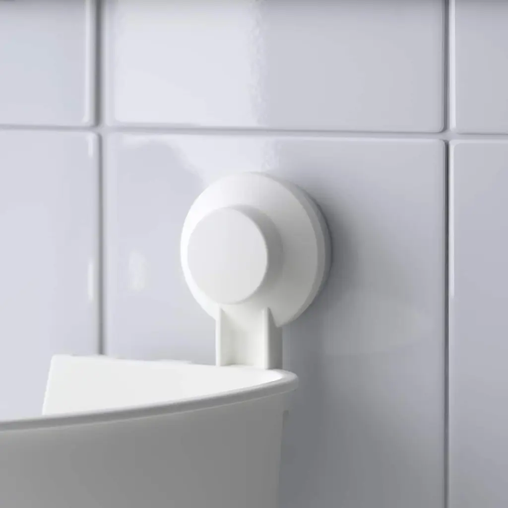 TISKEN Corner basket with suction cup - white. Water drains easily through the holes in the bottom. One push assembly - clean the wall surface and push to attach. No tools are needed. The suction cups have a tight grip on smooth surfaces like glass or tiles. Holds up to 6 lbs.