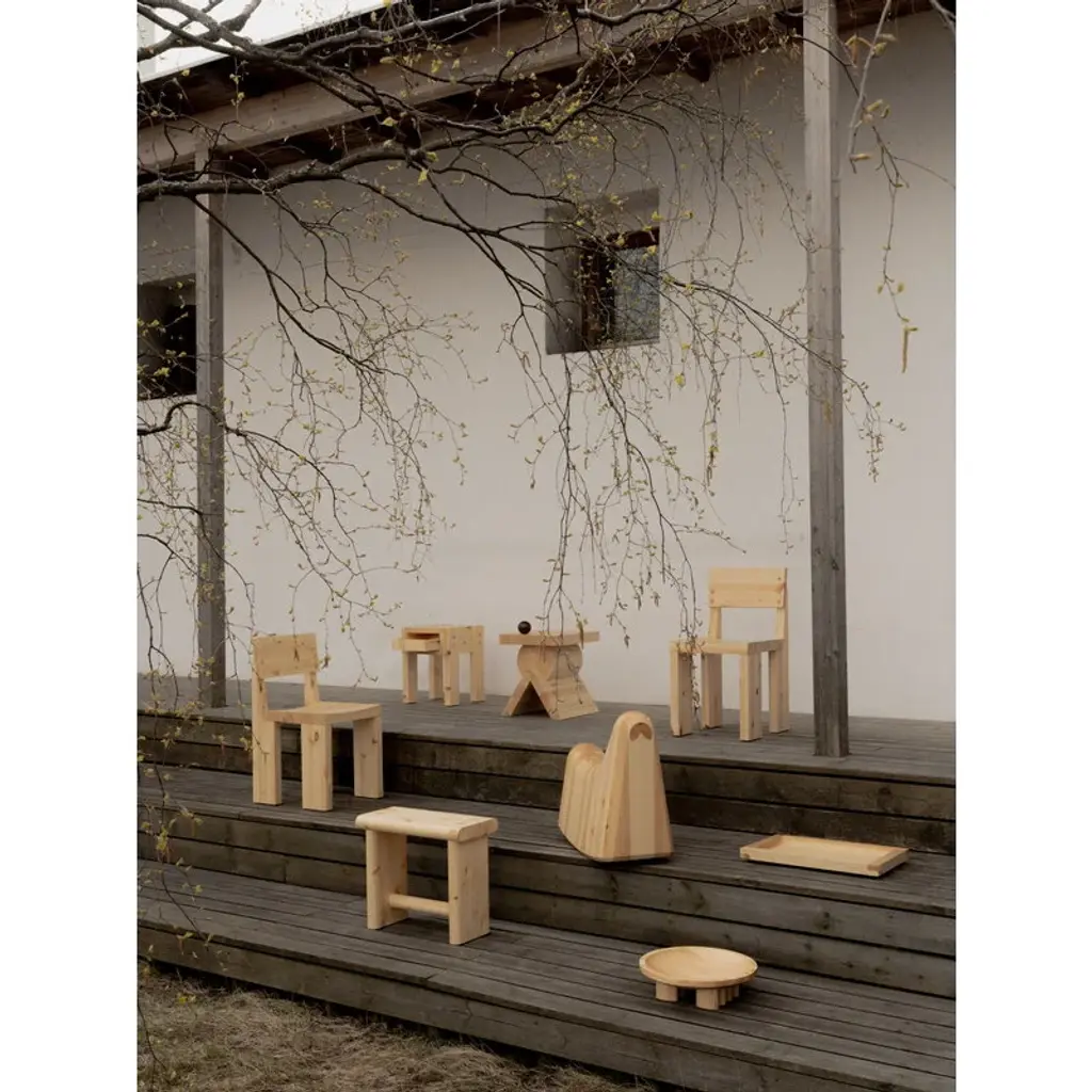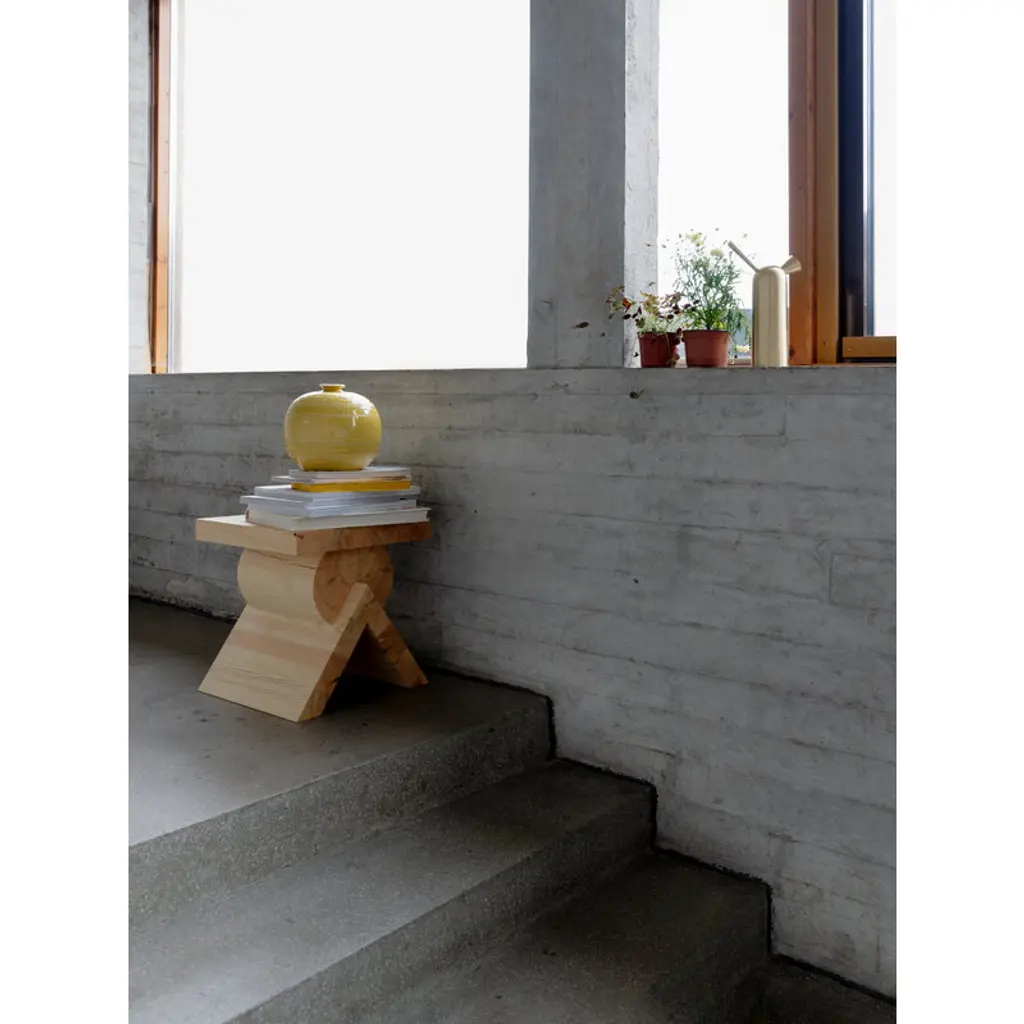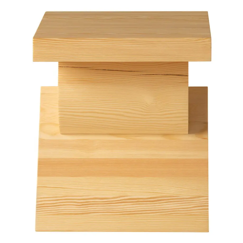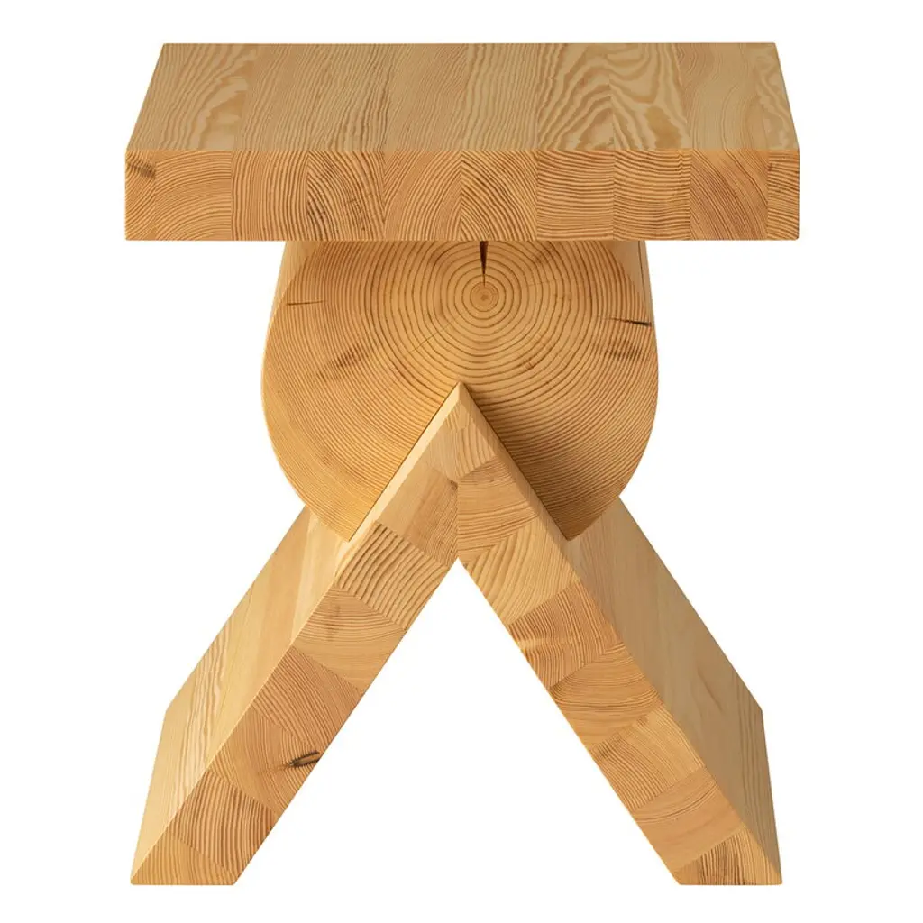 Vaarnii's AA side table, designed by Kwangho Lee, consists of three seemingly simple elements stacked on top of each other: a slat functioning as the tabletop, slanted legs forming an inverted V-shape, and an entire log in the middle. However, joining the three is no simple task, as it actually requires a lot of skill and know-how from the carpenters. Crafted from Finnish pinewood, the fascinating design will become even more interesting over time, as the natural oils and resins of the wood will react to UV rays and slowly turn the table’s color into a lovely honey shade. Pine is also softwood, meaning that scratches and dents are bound to form on the surface. Vaarnii encourages you to embrace these imperfections and see them as characterful signs of aging that only add to the allure of the piece. The multifunctional small table also works well as a stool or bench.