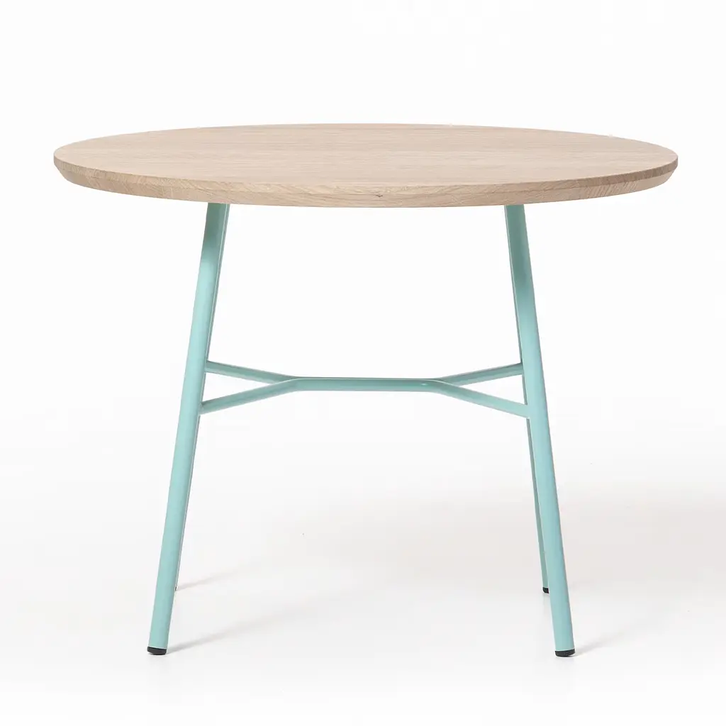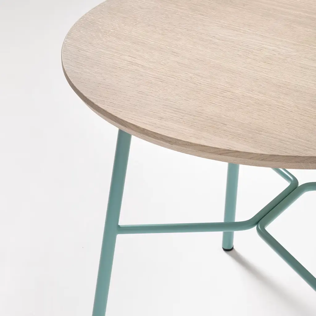 Marked by a fresh design coupling a turquoise cylindrical metal base and a circular top in natural oak, this side table makes for a striking addition to both indoor and outdoor contexts. It comes in HPL, marble, or solid wood variants adding to multiple finishes for the base, please inquire with the Concierge for options and pricing.