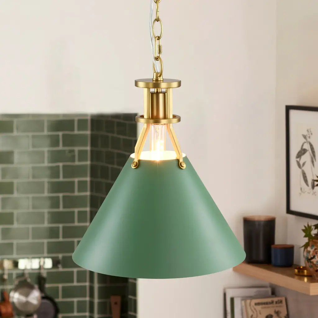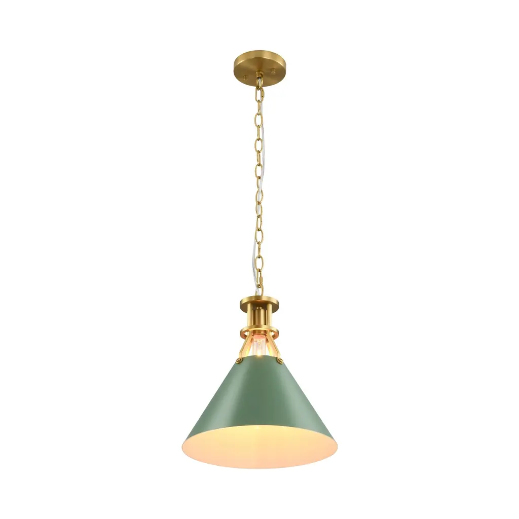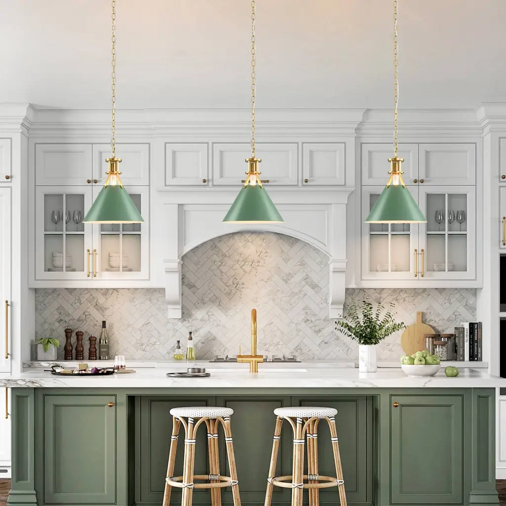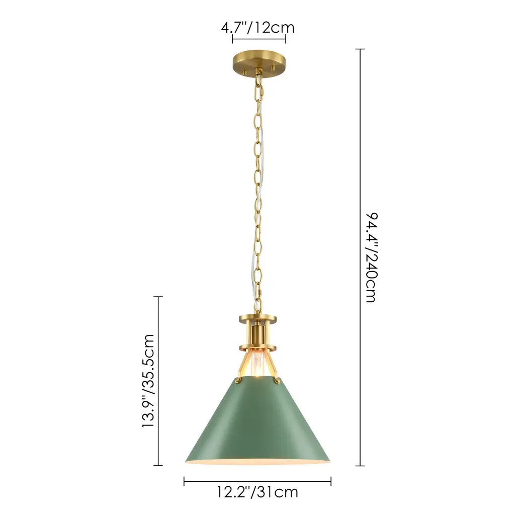 Make a bold style statement with this modern cone pendant light, featuring a sleek matte black/white/green exterior paired with a brushed gold accent and a crisp white interior. The 12.2-inch diameter metal shade directs light downward, providing focused illumination ideal for kitchen islands, dining tables, and bar areas. The white interior enhances light reflection, creating a brighter and more inviting glow. With a 78.74-inch adjustable chain, this pendant offers flexible installation for various ceiling heights. Features: Dimensions: (see image gallery for dimensional drawing)