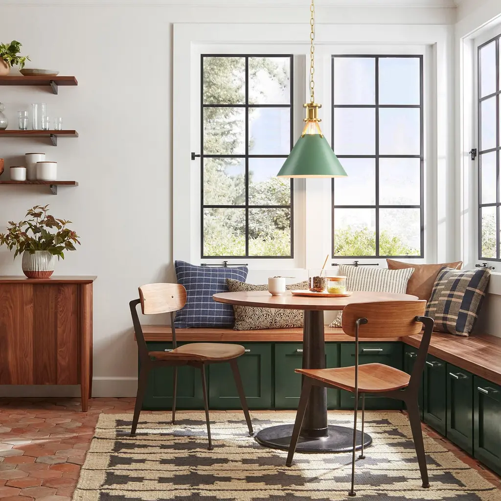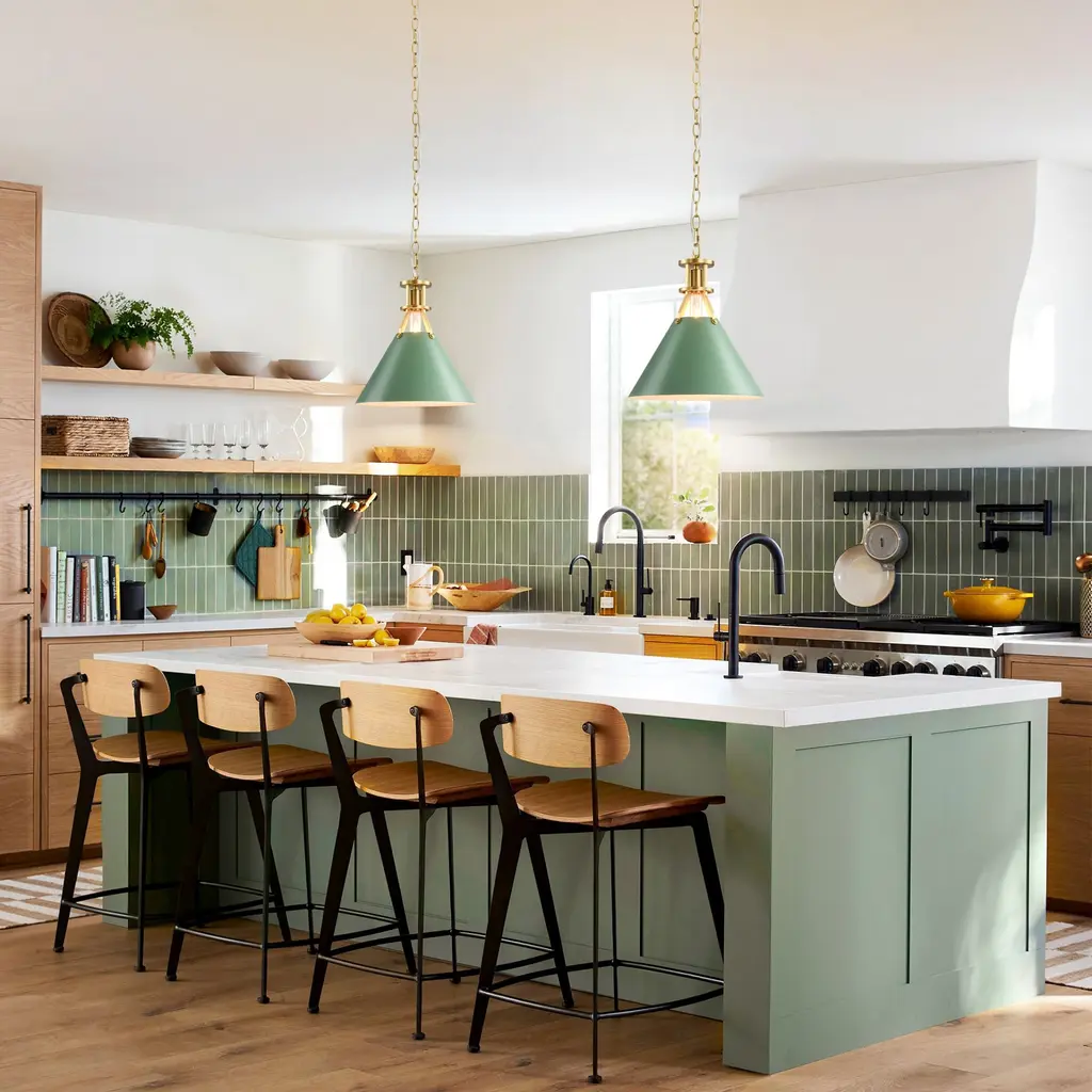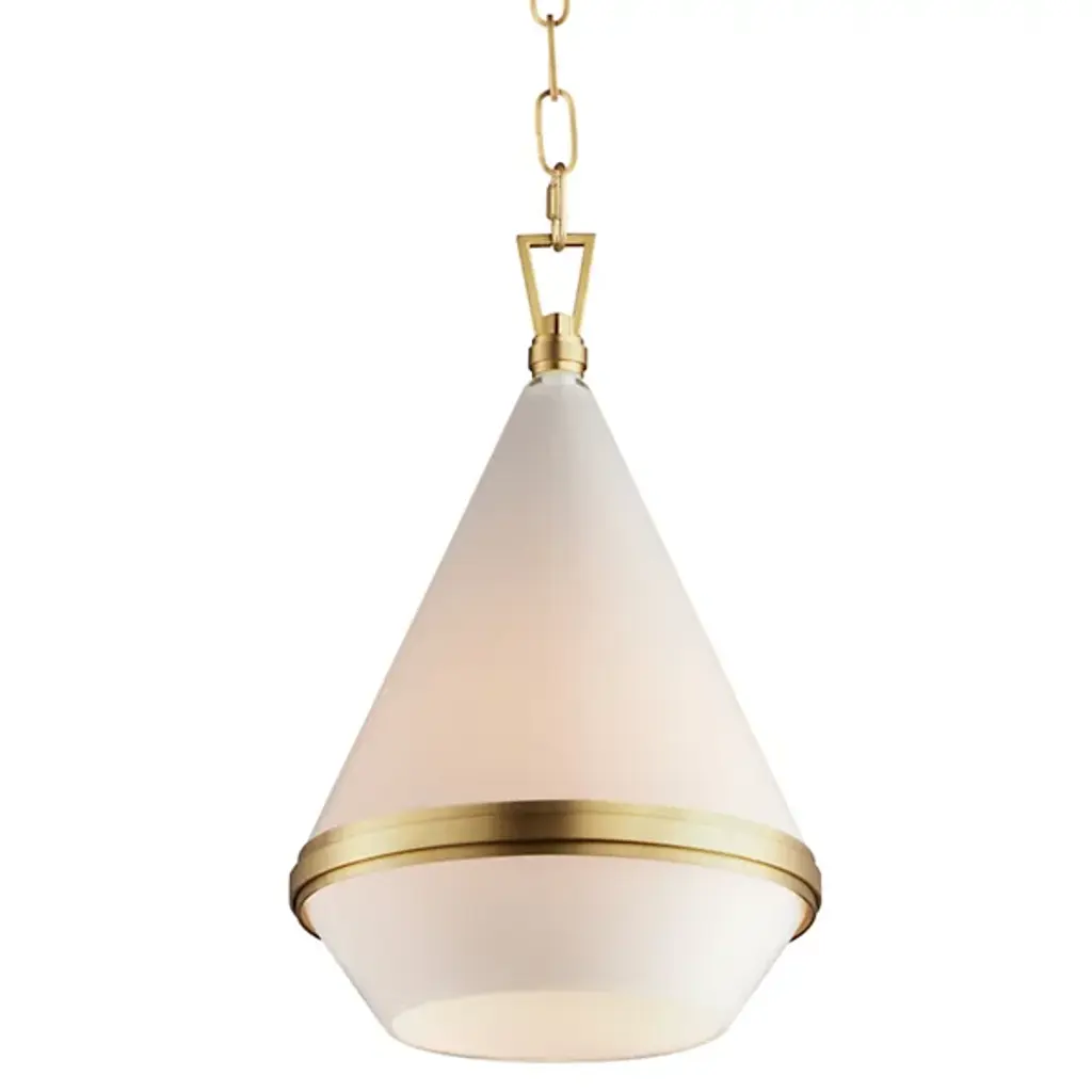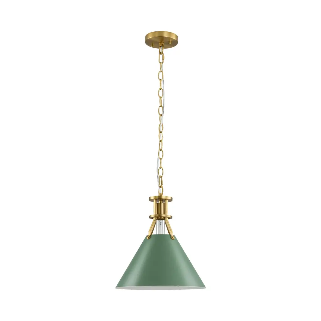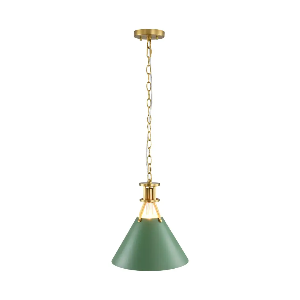 Make a bold style statement with this modern cone pendant light, featuring a sleek matte black/white/green exterior paired with a brushed gold accent and a crisp white interior. The 12.2-inch diameter metal shade directs light downward, providing focused illumination ideal for kitchen islands, dining tables, and bar areas. The white interior enhances light reflection, creating a brighter and more inviting glow. With a 78.74-inch adjustable chain, this pendant offers flexible installation for various ceiling heights. Features: Dimensions: (see image gallery for dimensional drawing)