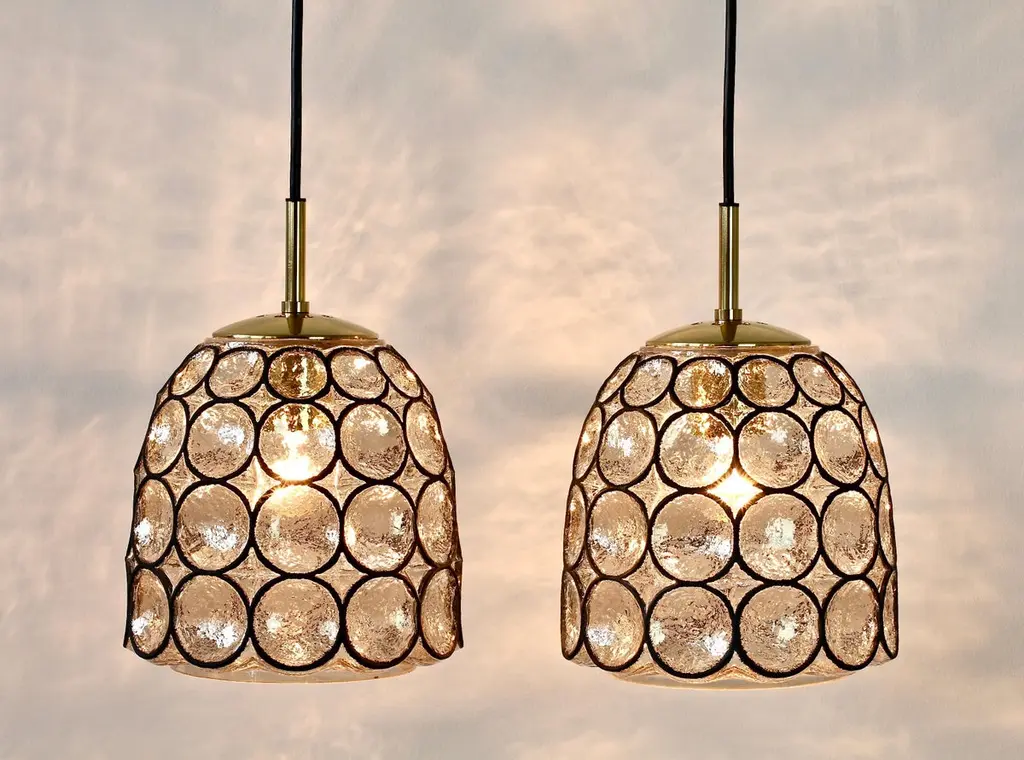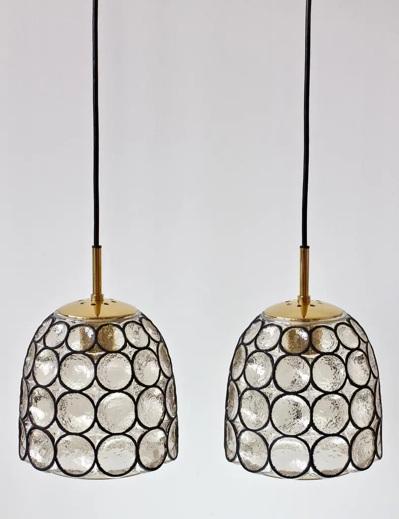 Pair of Limburg Glashutte vintage Mid-Century Modern minimal, geometric and bell shaped pendant ceiling lamp or light fixtures made in Germany, circa 1965. Featuring thick heavy mouth blown glass with con-caved round "iron" rings - reminiscent to the bullseye circular discs found in British and European windows from the late Middle Ages or late medieval period, also known as 'crown glass' or 'crown bullion glass'. This style of lights cast a wonderful light across the room. A very Minimalistic, simple and pleasing Contemporary Art Deco lantern style form. Perfect over a pair of nightstands or side tables in the bedroom, kitchen bar or dining room. Each light requires a single standard E27 lightbulb (E26 for U.S. customers) (max.75W).