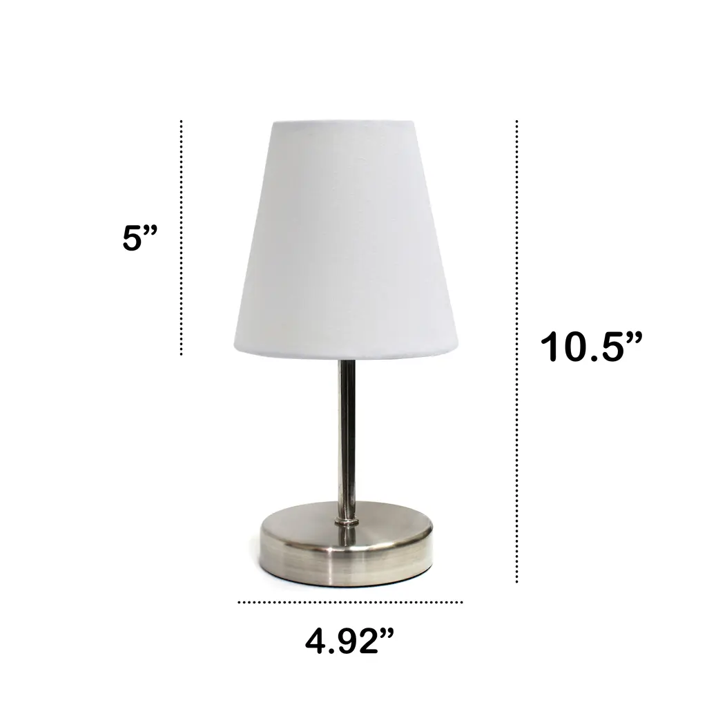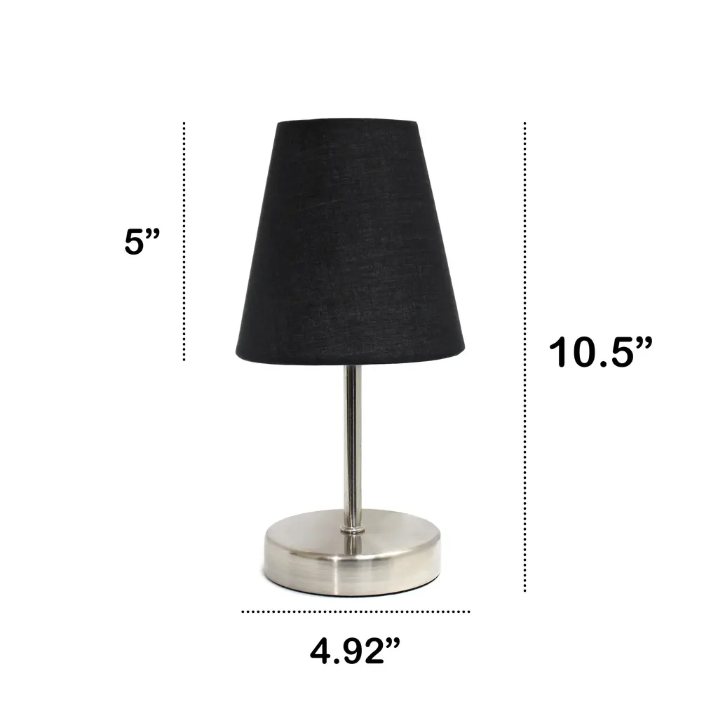 This timeless styled table lamp is unique to its size, standing at just 10.5" tall to sit perfectly atop your bedroom nightstand, end table, college dorm desk, or child's room. A round bottom sand nickel stick base is fixed beneath a standard empire fabric shade in a number of different color options to compliment your space as needed. You'll find the perfect shade color option to suit your decor needs in no time.Features: