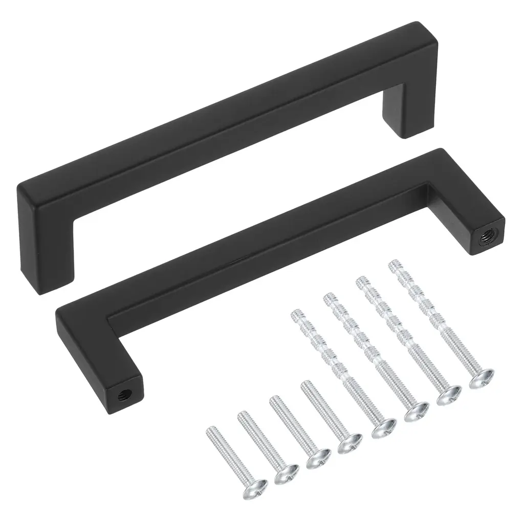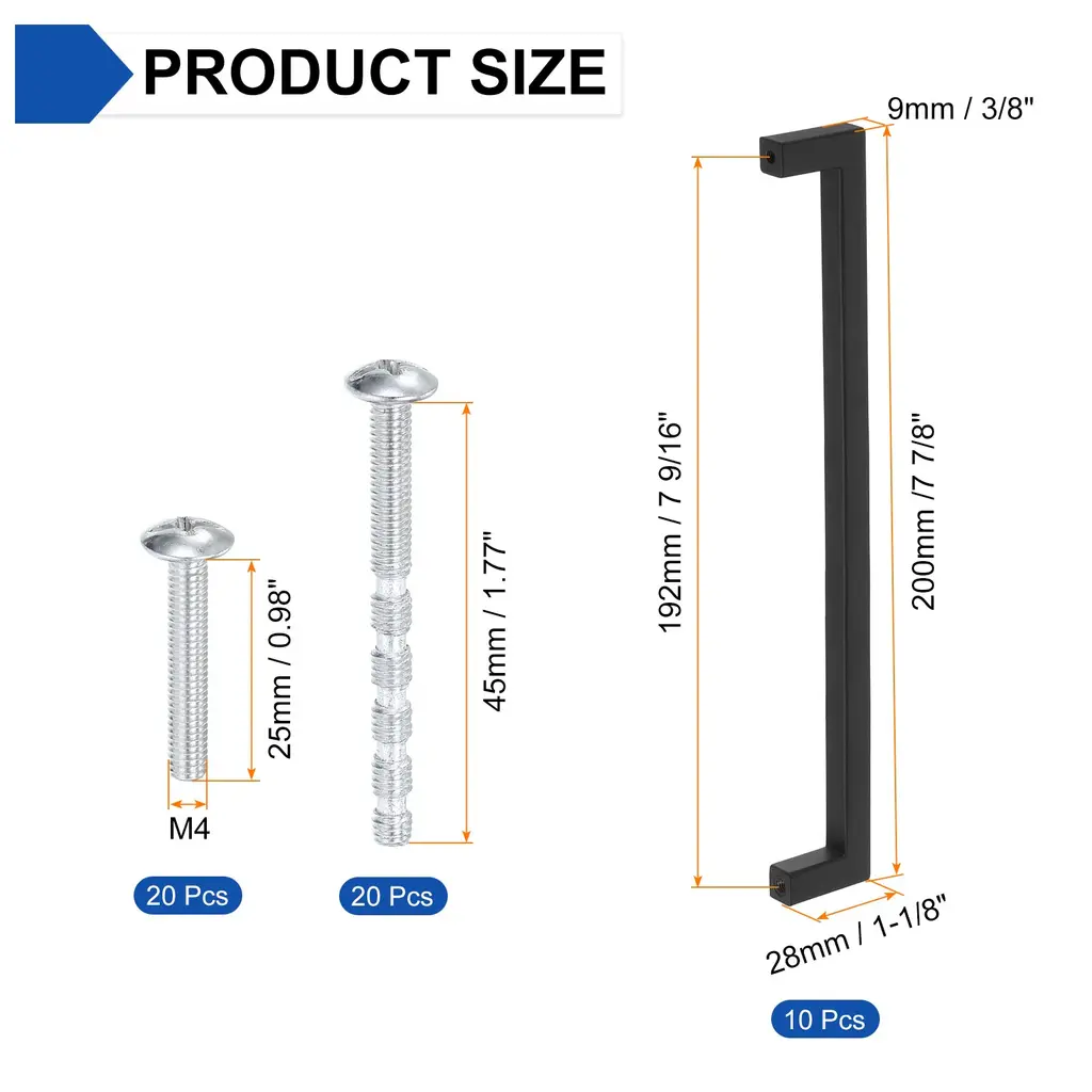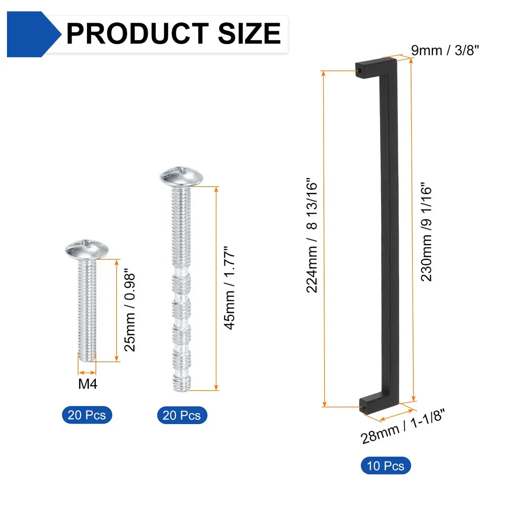 Description[Material] - Our drawer bar pulls are made of zinc alloy, they are solid tube structure, which is more robust, durable and corrosion-resistant, easy to use and has a long service life.[Slim Square Design] - The cabinets handle with a slim square appearance, its simple and modern design is suited for farmhouse, vintage, traditional and transitional styles. These handles will give your cabinets a clean and tidy look, easily enhancing the elegance of your cabinets doors and drawers.[Deep Hole Thread Design] - These square cabinets pulls have a thick solid base, which is not easy to break and deform. The deep threads allow the screws to bite more tightly, making the handle and the cabinets door heel fit together and not easy to fall off, making it easy to pull out the drawer.[Wide Application] - The Kitchen Cabinets Handles are great furniture hardware accessories, suitable for different styles of furniture and rooms. Such as kitchen cabinets, drawers, cupboards, wardrobes, bedside tables, etc.SpecificationMaterial: Zinc AlloyScrew-hole Center: 3 3/4 inch(96mm)Overall Length: 4 1/8 inch(105mm)Width: 3/8 inch(9mm)Height: 1 1/8 inch(28mm)Hole Thread Specifications: M4Color: BlackPackage Includes10pcs x Square Drawer Handles20pcs x 25mm Screws20pcs x 45mm Screws