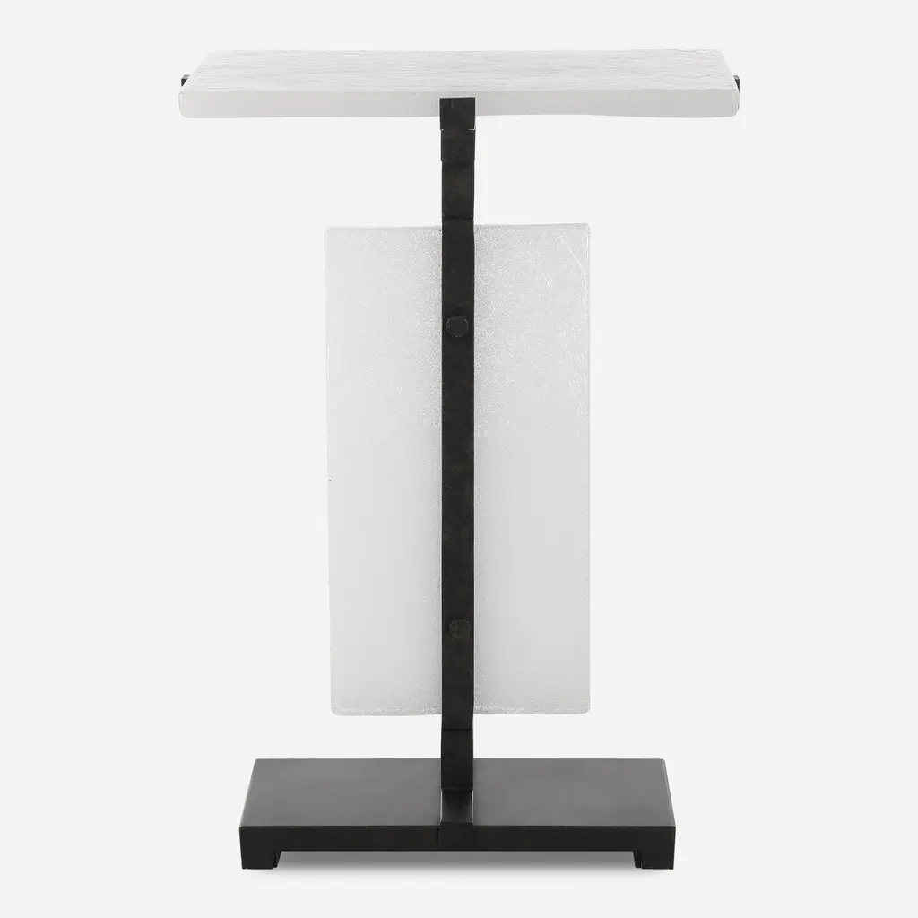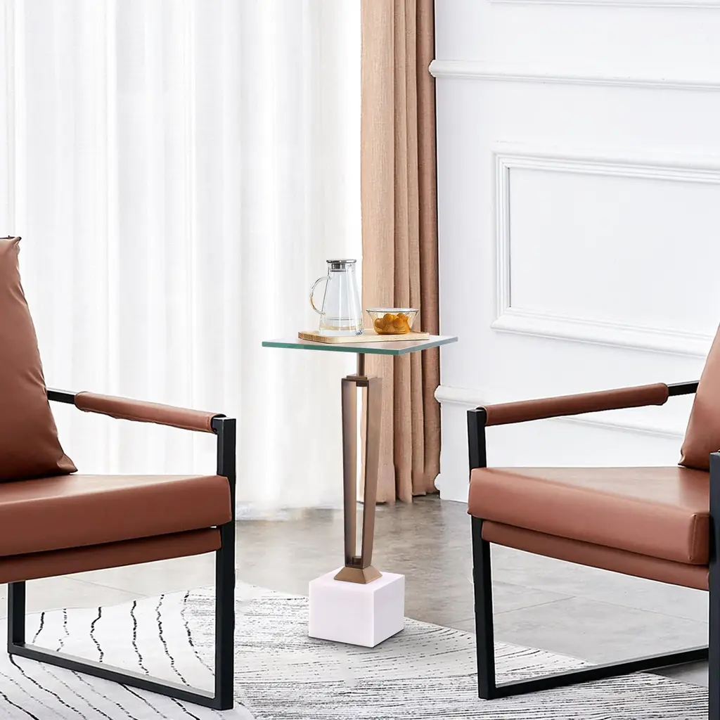 This elegant martini table features a stunning white marble base as its anchor. The tabletop, a substantial piece of tempered glass with softly rounded corners, is affixed to a brushed brass body. This design allows the radiant beauty of the marble base to take center stage.