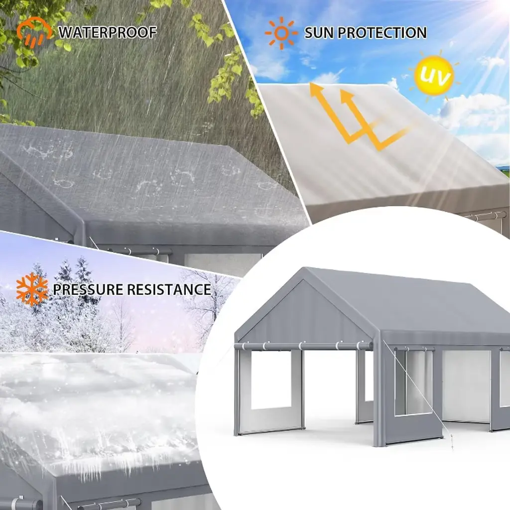 Introducing the 13 x 20 FT Metal Carport, the ultimate all-inclusive outdoor shelter designed to protect your vehicle from the elements. Constructed with a sturdy iron pipe metal frame, this carport offers exceptional durability and stability, ensuring your car stays safe year-round. The weatherproof PE cover provides full enclosure, shielding your vehicle from rain, snow, sun, and wind.This versatile car shelter features a unique design with four side-opening doors and four roll-up windows for excellent ventilation and easy access. The grey canopy not only adds a sleek, modern look but also blends seamlessly with any outdoor environment. Whether you need a portable garage tent for your car, truck, or other equipment, this heavy-duty car canopy is the perfect solution.Key Features:- Robust iron pipe metal frame for maximum strength and long-lasting use- Weatherproof PE cover offers full protection against harsh weather conditions- Four side-opening doors for convenient entry and exit- Four roll-up windows ensure proper airflow and ventilation- Spacious 13 x 20 FT size accommodates most vehicles and outdoor storage needs- Portable design allows for easy assembly, disassembly, and relocation- Stylish grey color complements any outdoor settingIdeal for use as a car shelter, outdoor garage tent, or portable car canopy, this metal carport provides reliable protection and convenience. Whether you want to safeguard your vehicle from sun damage, snow accumulation, or heavy rain, this carport is built to withstand the elements while keeping your vehicle secure and dry.Invest in the 13 x 20 FT Metal Carport with Side-Opening Door & Roll-Up Windows for a practical, durable, and stylish outdoor car shelter solution. Protect your vehicle and enjoy peace of mind with this all-inclusive metal carport designed for easy use and long-term performance.