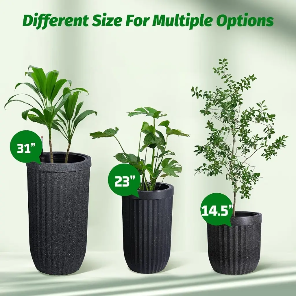 These self-watering pots showcase a luxurious marble-inspired finish created with advanced Microcrystal Technology, making them approximately 30% lighter than ceramic versions while offering strong resistance to cracks, UV rays, scratches, and fading. This ensures they maintain an elegant appearance year-round, suitable for both indoor and outdoor settings. Equipped with a water level monitor, these tall planters allow effortless tracking of water levels and watering schedules, removing guesswork and saving you time while keeping your plants consistently hydrated and healthy. The integrated water level tracking system helps prevent issues caused by over- or under-watering, reducing maintenance to around two weeks and supporting optimal plant growth with minimal attention. Designed for versatility, these planters are suitable for use in living rooms, offices, patios, gardens, or any space needing a stylish yet practical planting solution. Available in three convenient sizes—14.5”, 23”, and 31”—and three classic colors: Black, White, and Gold, they easily accommodate a wide variety of plants and complement diverse décor styles. Hidden wheels and built-in handles add mobility and ease of lifting, allowing you to move and position your planters effortlessly. Combining modern design with user-friendly features, these planters are an excellent choice for enhancing your home or garden environment with both beauty and function.