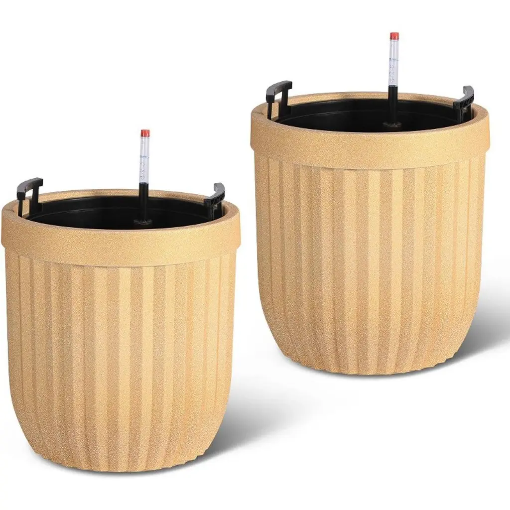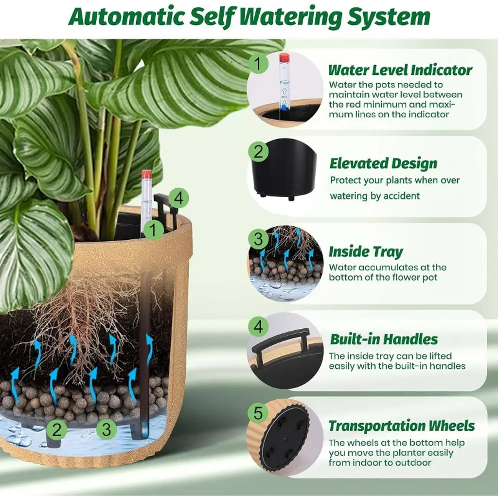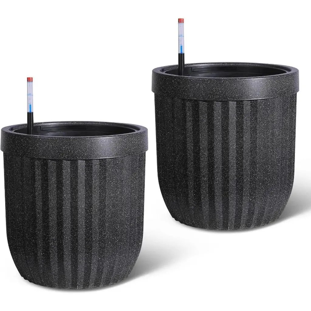 These self-watering pots showcase a luxurious marble-inspired finish created with advanced Microcrystal Technology, making them approximately 30% lighter than ceramic versions while offering strong resistance to cracks, UV rays, scratches, and fading. This ensures they maintain an elegant appearance year-round, suitable for both indoor and outdoor settings. Equipped with a water level monitor, these tall planters allow effortless tracking of water levels and watering schedules, removing guesswork and saving you time while keeping your plants consistently hydrated and healthy. The integrated water level tracking system helps prevent issues caused by over- or under-watering, reducing maintenance to around two weeks and supporting optimal plant growth with minimal attention. Designed for versatility, these planters are suitable for use in living rooms, offices, patios, gardens, or any space needing a stylish yet practical planting solution. Available in three convenient sizes—14.5”, 23”, and 31”—and three classic colors: Black, White, and Gold, they easily accommodate a wide variety of plants and complement diverse décor styles. Hidden wheels and built-in handles add mobility and ease of lifting, allowing you to move and position your planters effortlessly. Combining modern design with user-friendly features, these planters are an excellent choice for enhancing your home or garden environment with both beauty and function.