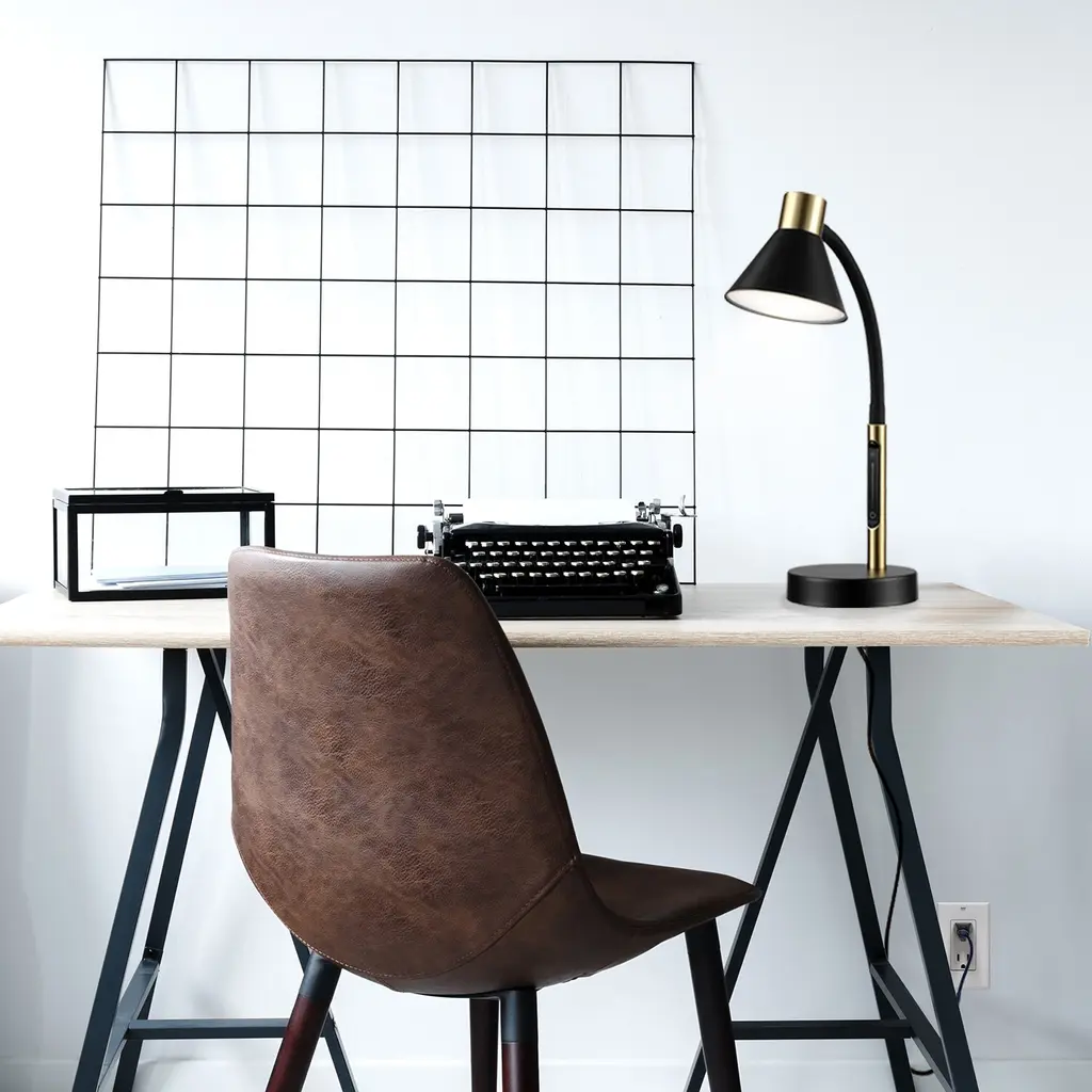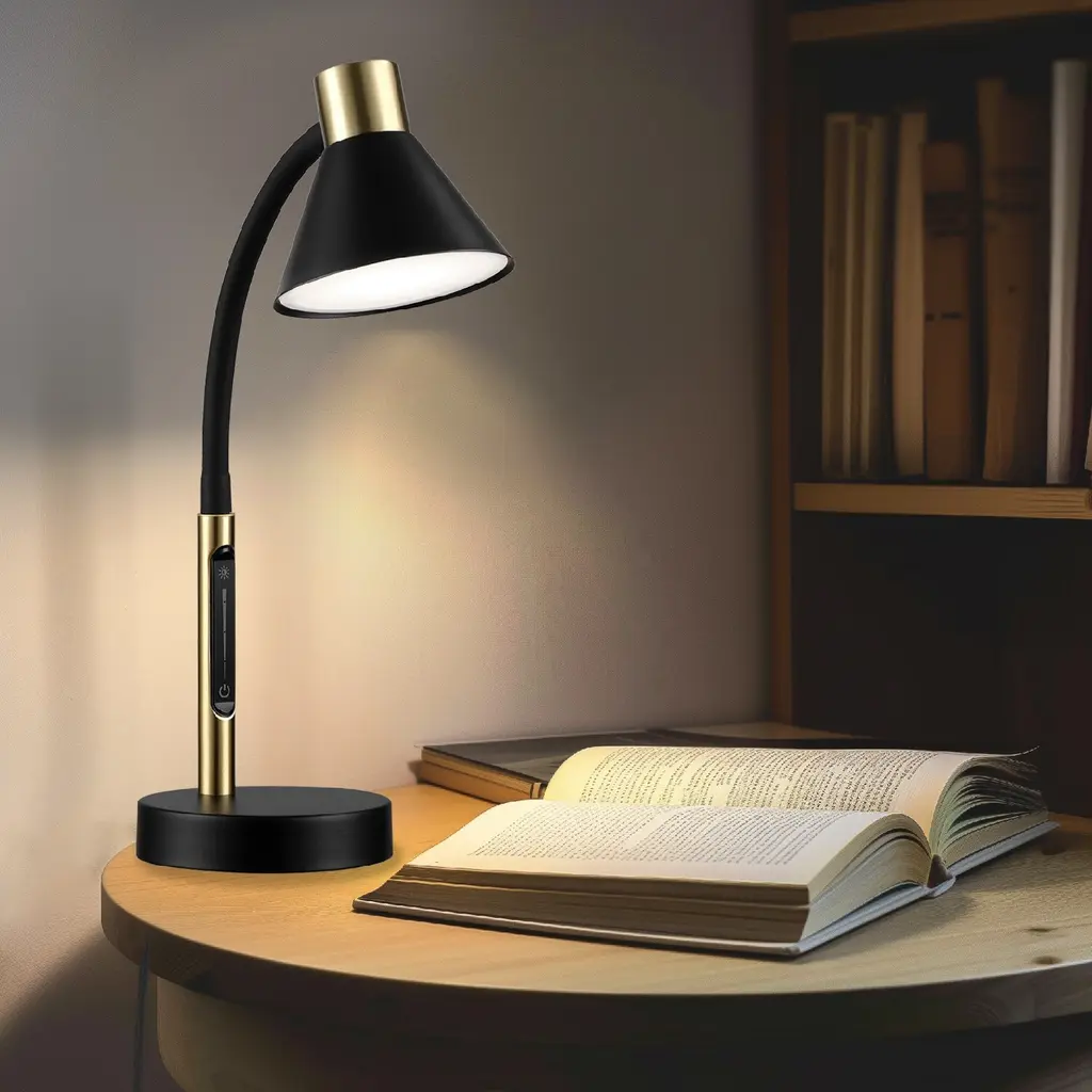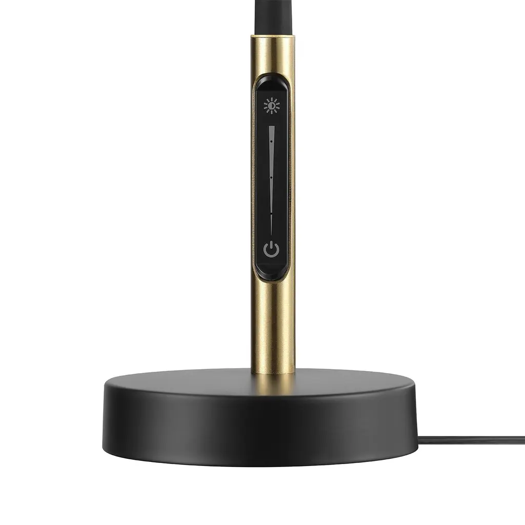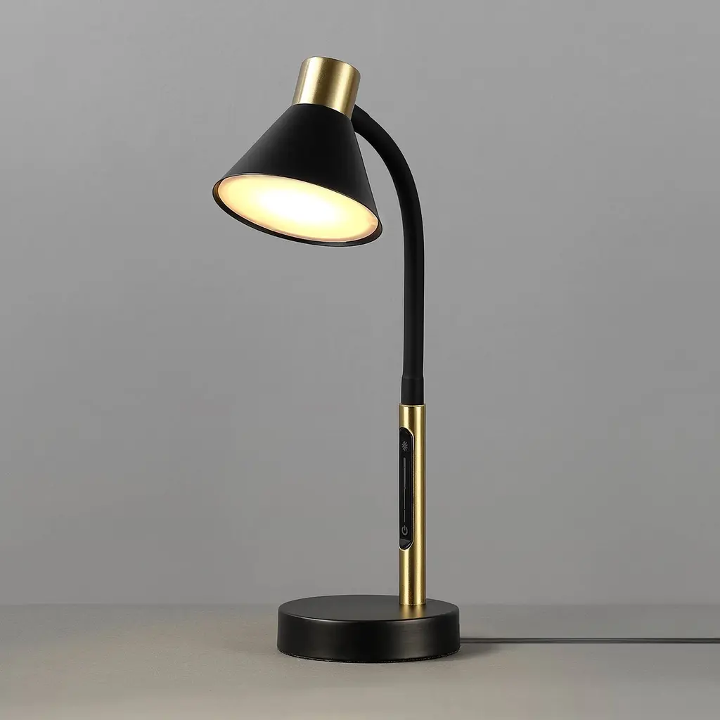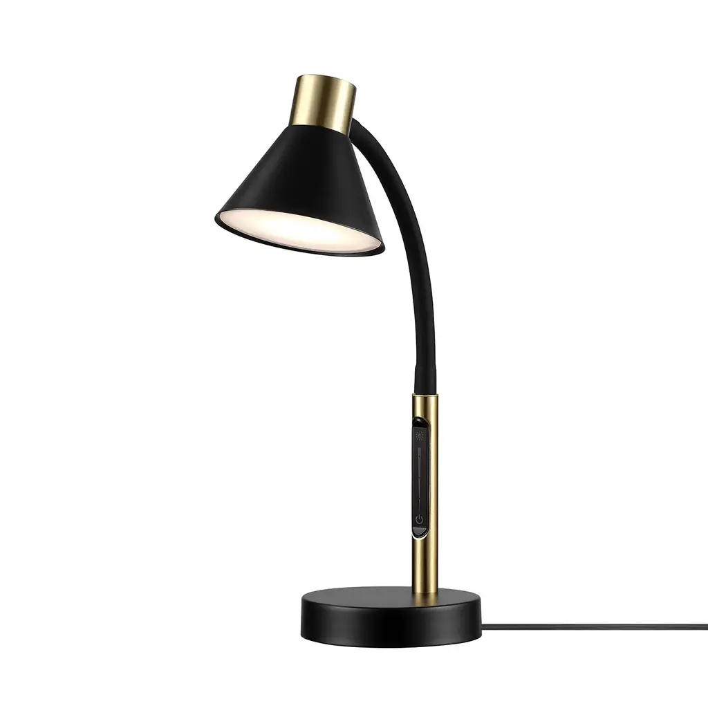 Sleek, unobtrusive, modern, functional - four little, yet big words that best describe this 7.5-Watt, 15-inch LED Integrated Desk Lamp. Leaving just a small footprint on your desk or nightstand, its sleek base and slim unobtrusive design ensures that it is truly a quintessential task light. Functional at best, the adjustable silicone gooseneck allows you to move the light around to best suit your needs, while the easily accessible stepless dimming switch is simple to use and convenient to find. Completed by an overall standard design with a matte black finish and stunning matte brass accents, you'll be thrilled to have welcomed this LED Integrated Desk Lamp to your lighting decor. After all, minimalistic, functional, streamlined lighting is super trendy right now and exactly what you want to add to your home!