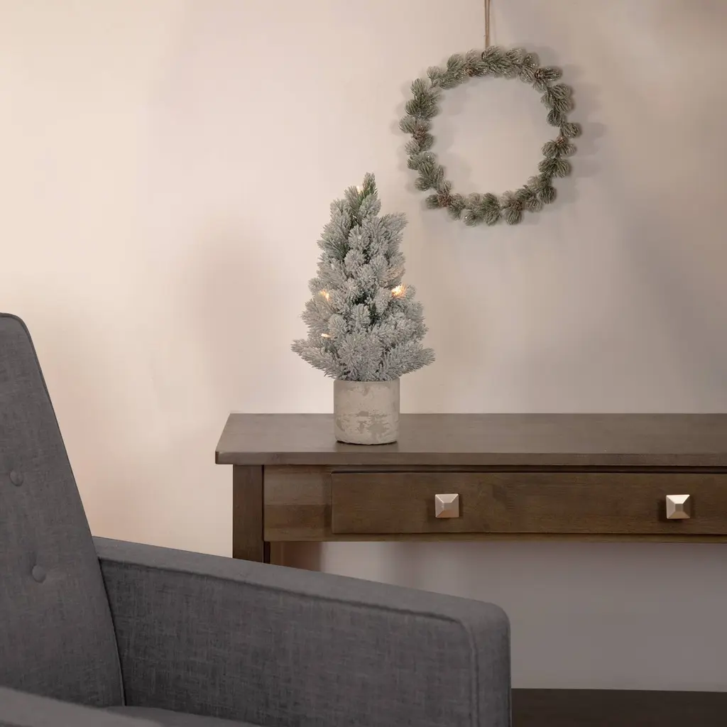 16" Led Lighted Mini Frosted Pine Christmas Tree In Cement Base - Green - 1.5 Foot