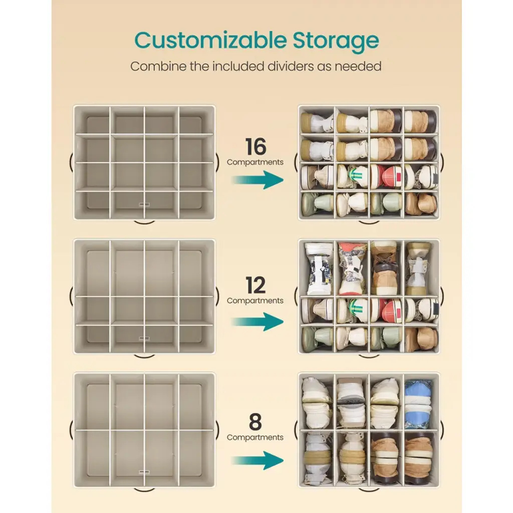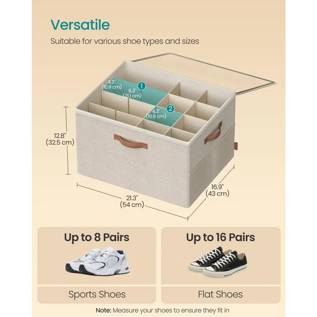 16-pair Fabric Shoe Organizer, Adjustable Compartments & Side Pockets, Foldable Storage Bin For Closet, Cappuccino Beige