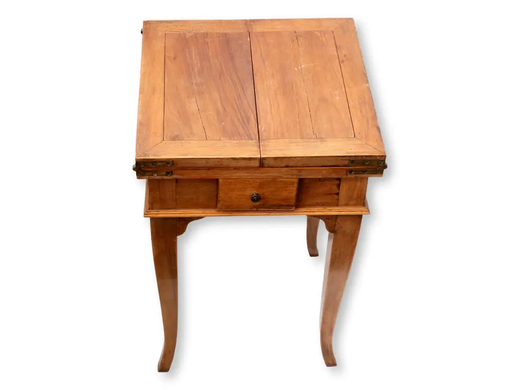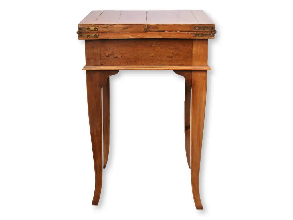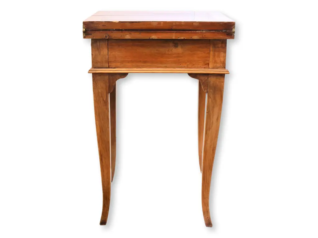 This early 18th-century French walnut work table features a fold-out top and elegantly flared, tapered legs. Crafted from solid walnut, it retains its original patina, showcasing the natural beauty of the wood. The fold-out top provides extra workspace, while the small drawer offers convenient storage. A fine example of early French craftsmanship, this table is perfect as a functional piece or a decorative accent, adding antique charm to any room. Unsigned. 28" wide with sides open/14" closed.