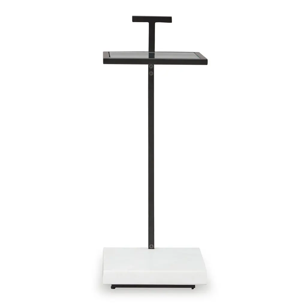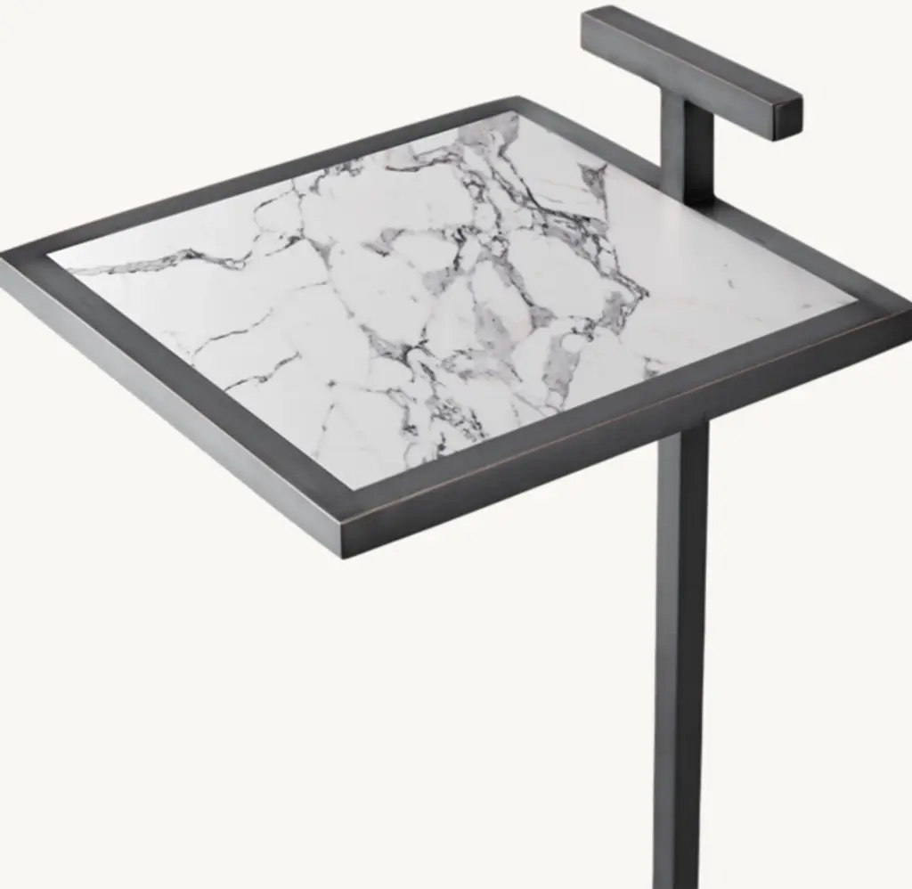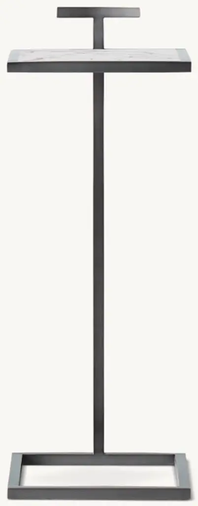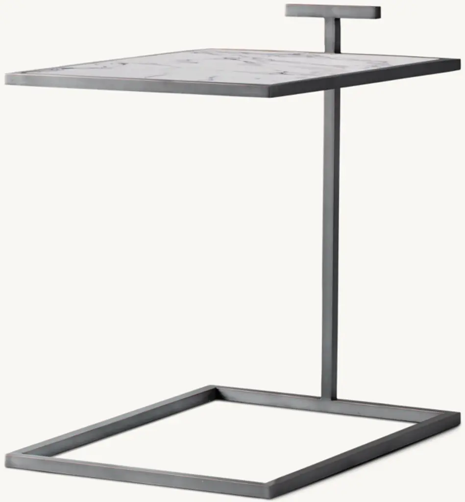 Our table's clean geometry reflects the understated Modernist design aesthetic of early 20th-century America. Its cantilevered, stainless steel frame is inset with natural stone, highlighting the compact, elegant proportions.