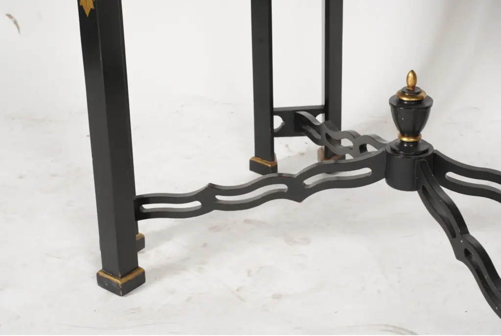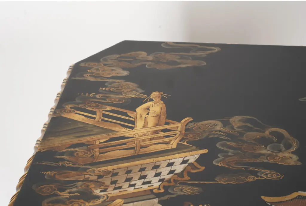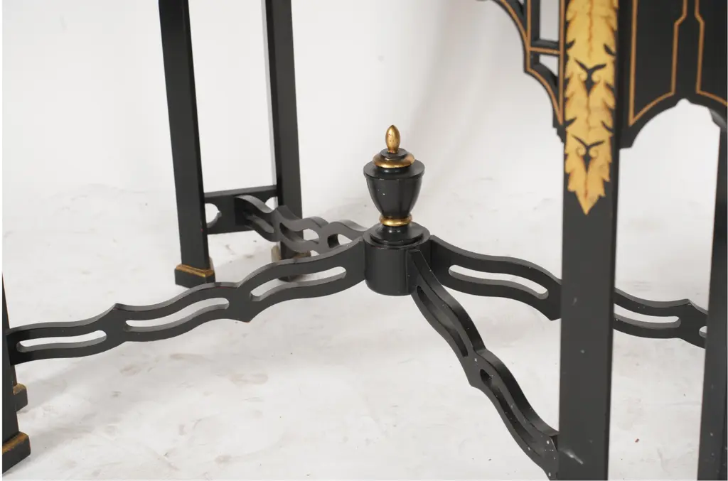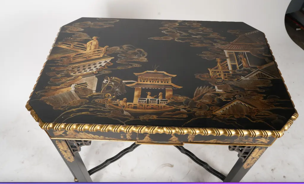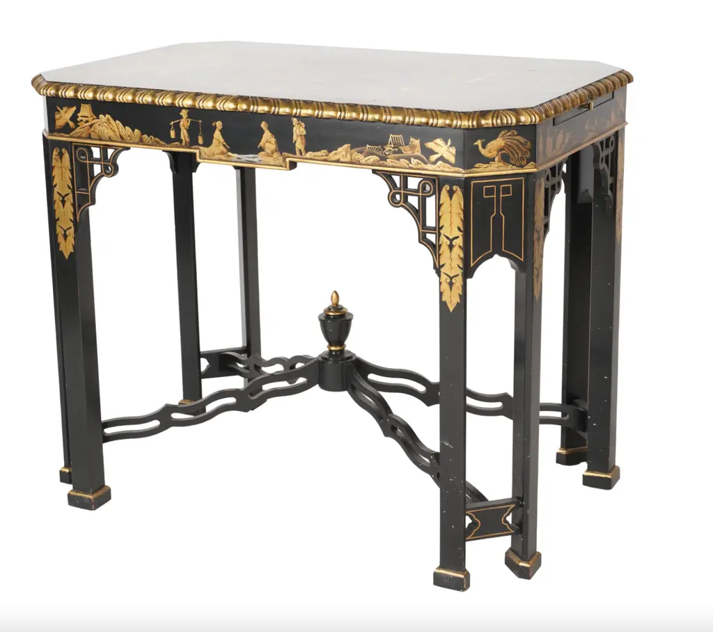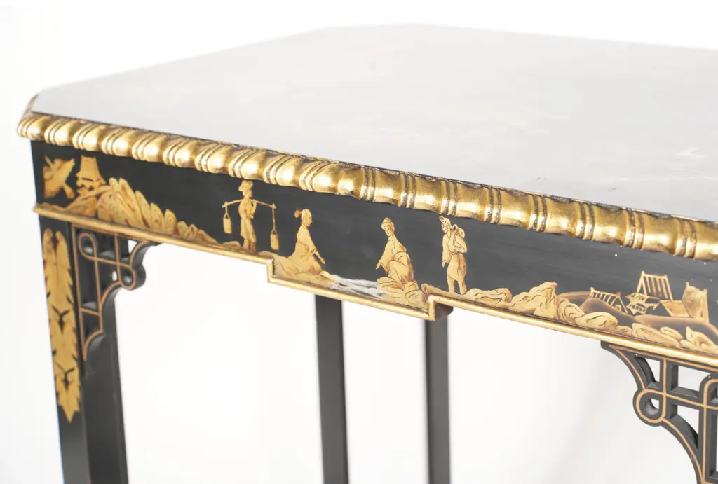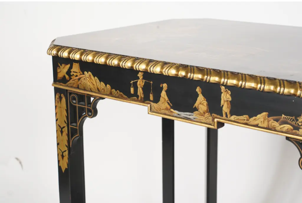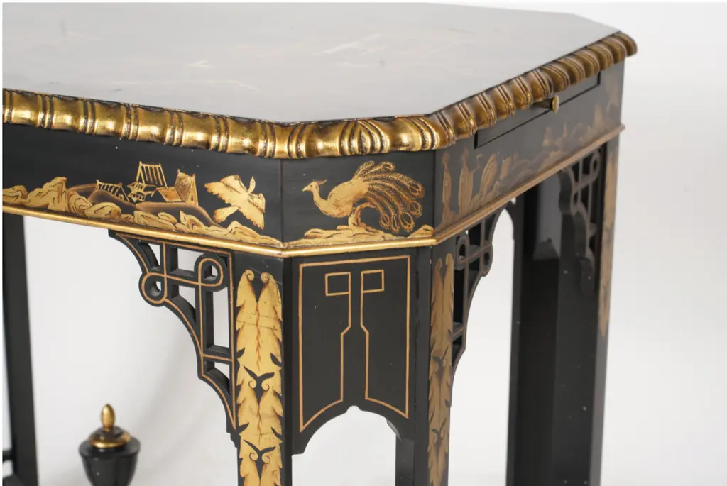 Extraordinary Find. There are two!!. Ultra Rare Chinese Chippendale Side Tables with Hand carved and Hand Painted Details and two pullout extensions, one on either side from John Widdicomb. Iconic Pieces from a famous collection. Condition Disclosure: Please understand nearly all of our inventory is comprised of rare to very rare vintage pieces. They are not new and will have some imperfections, it's part of the charm and history of owning a vintage piece. Understand what you're purchasing as not to be new furniture. Use the photos as your guide, they are part of the description. We strive to secure the finest vintage inventory available to us, our criteria is stringent and expectations are high, however these are vintage pieces that have shared a past life.