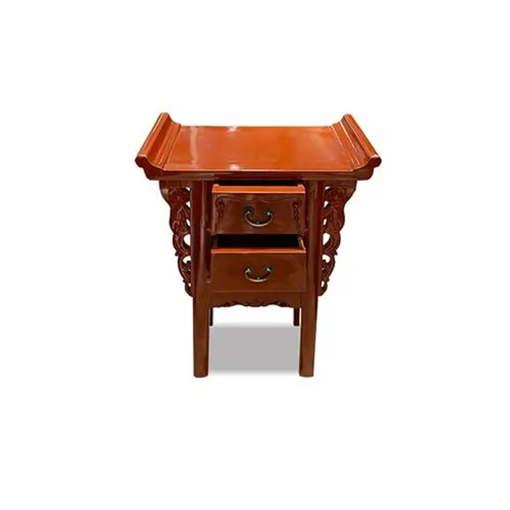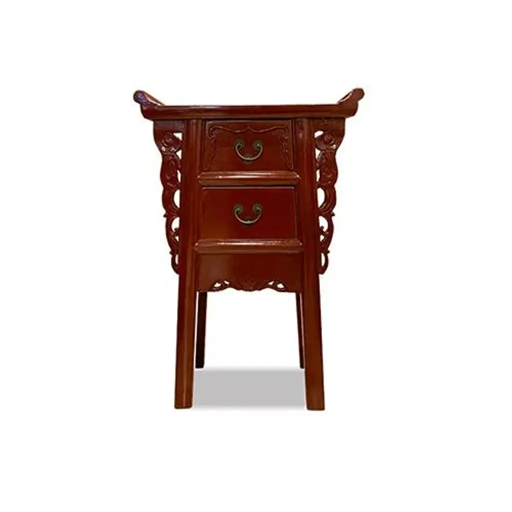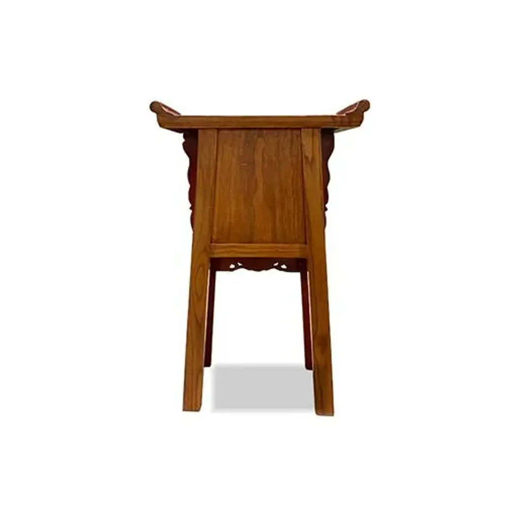 Asian Hand carving Wing side table is made out of elm wood. It has 2 drawers with carving detail on the side, It is a great piece for accent and side table. It can be used for storage. Material: Elm Wood Dimensions: 23.5"W x 12"D x 35.75"H, Desk top is 34"H Origin: China Condition: Perfect condition, all hand made wood joint.
