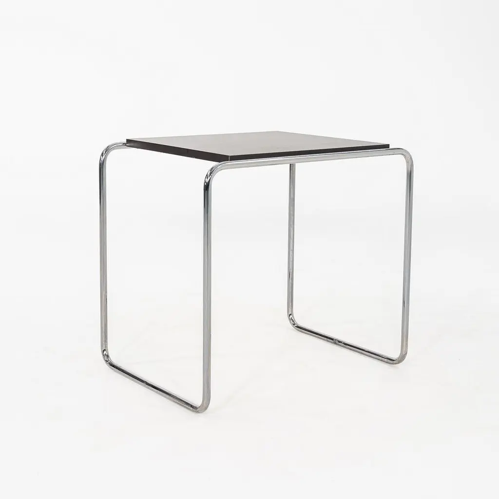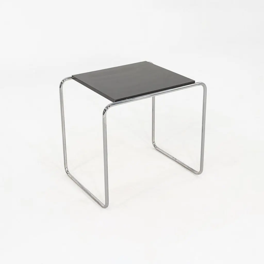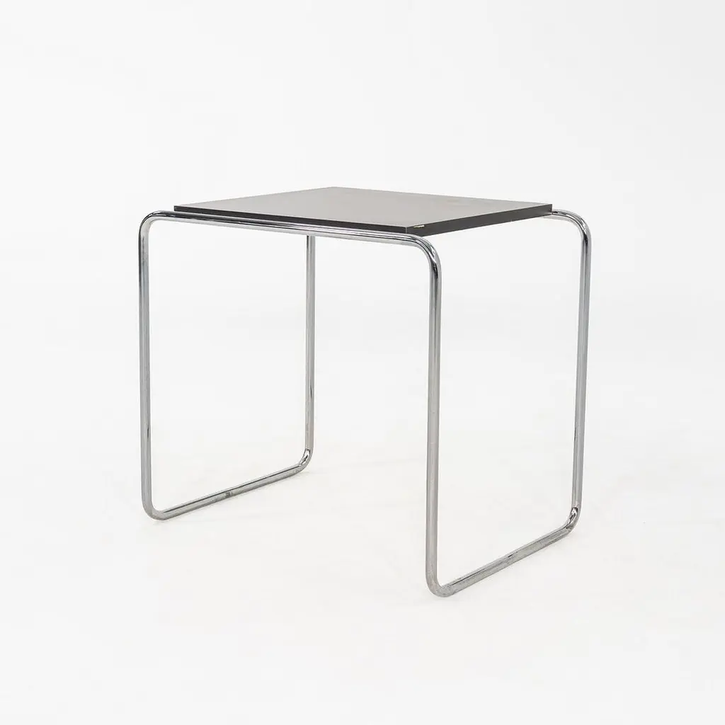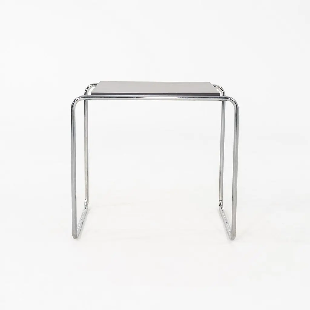 This is a Laccio Tall Side Table, originally designed by Marcel Breuer in 1925. These particular examples were produced by Thonet in the United States and date to the 1990s. The tables feature a tubular steel frame with a black laminate table top. The listed price includes one end table and there are three available to purchase. There is also a matching coffee table and smaller end table available that would be sold separately. Each table measures 20.25 inches deep, 26 inches long, and 24.5 inches high. These pieces do show wear from previous use including minor scratches and surface blemishes. Overall, the tables are in good to very good condition. Please see photos.