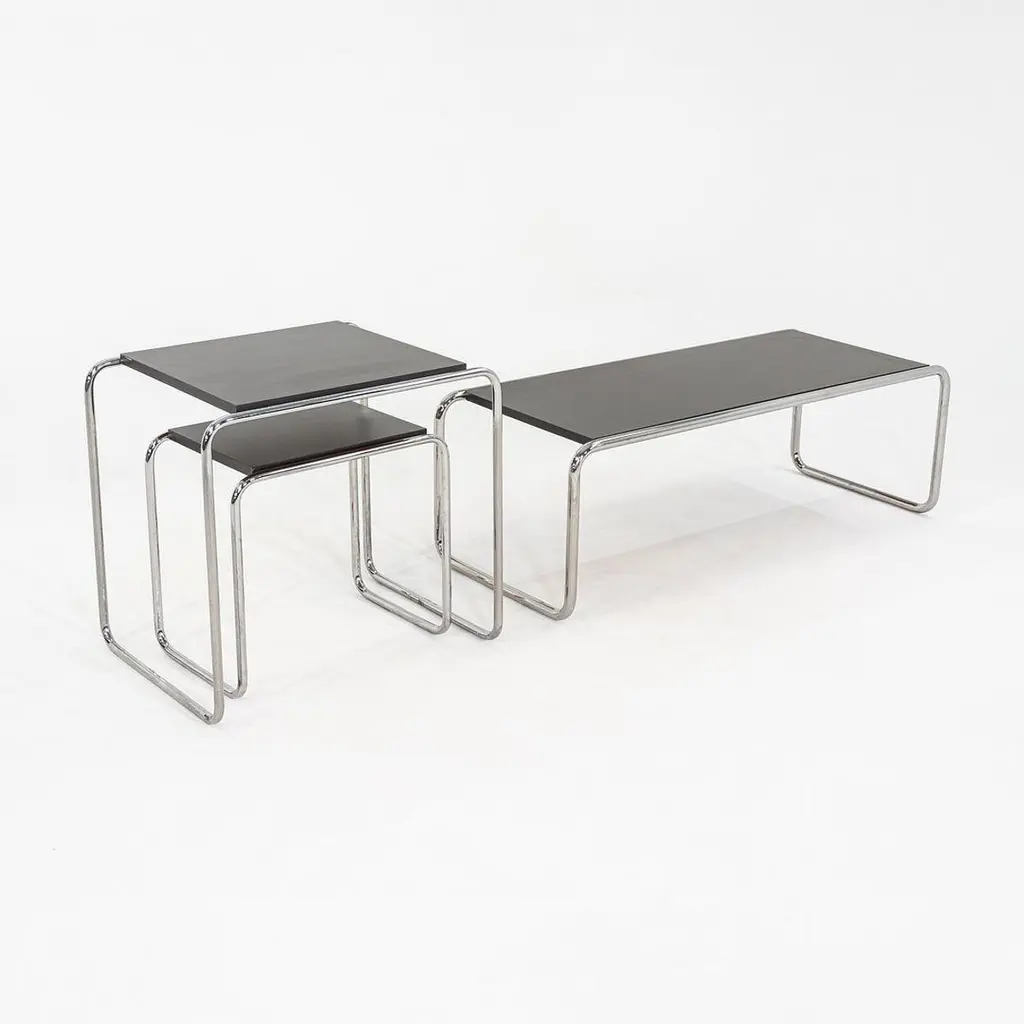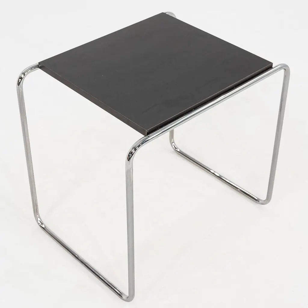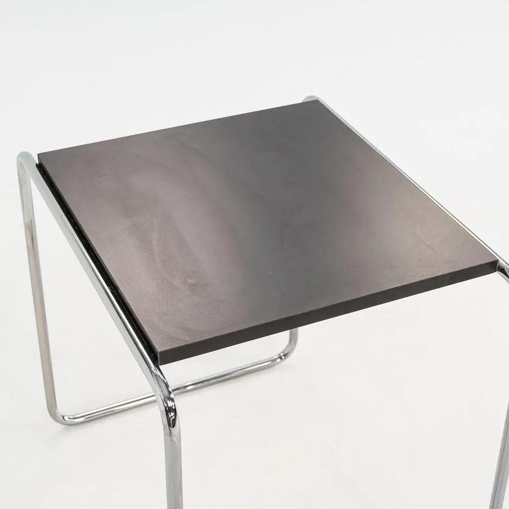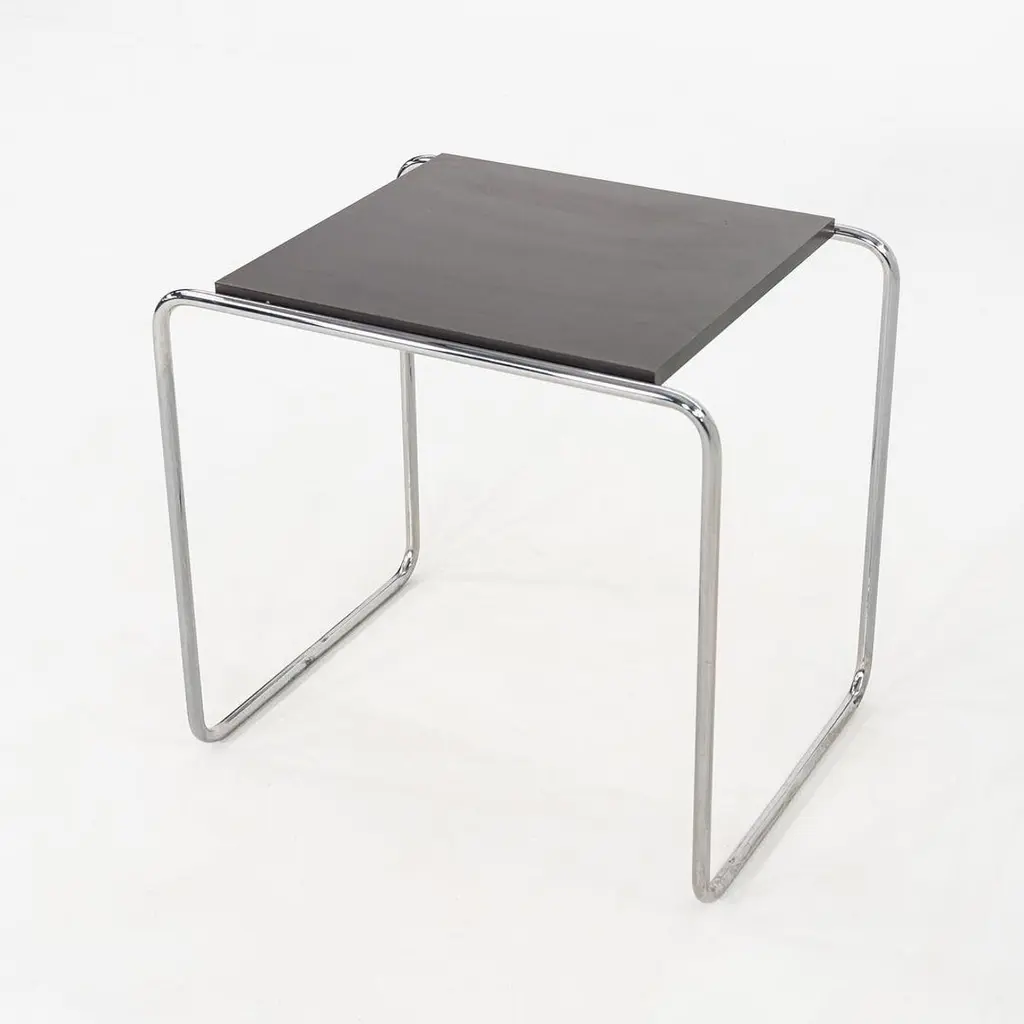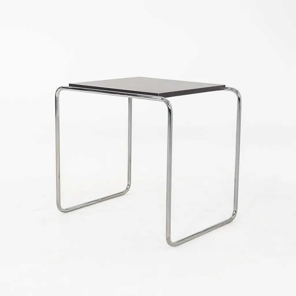 This is a Laccio Tall Side Table, originally designed by Marcel Breuer in 1925. These particular examples were produced by Thonet in the United States and date to the 1990s. The tables feature a tubular steel frame with a black laminate table top. The listed price includes one end table and there are three available to purchase. There is also a matching coffee table and smaller end table available that would be sold separately. Each table measures 20.25 inches deep, 26 inches long, and 24.5 inches high. These pieces do show wear from previous use including minor scratches and surface blemishes. Overall, the tables are in good to very good condition. Please see photos.