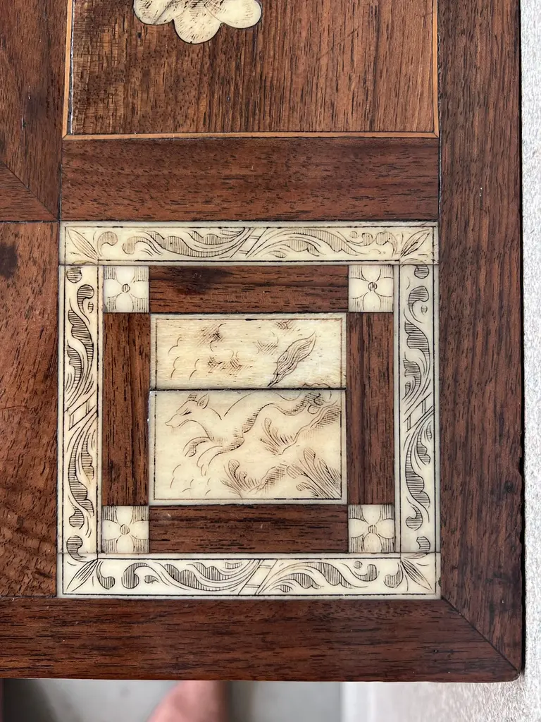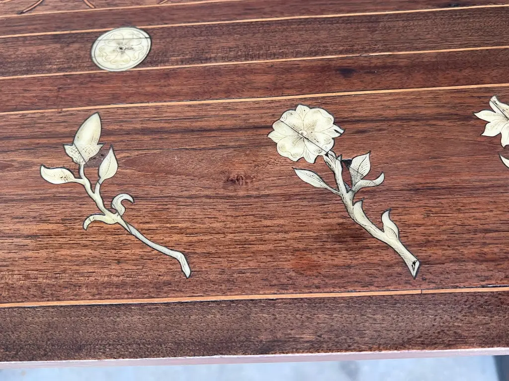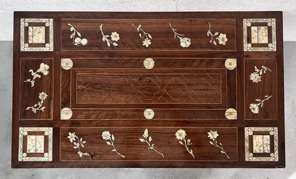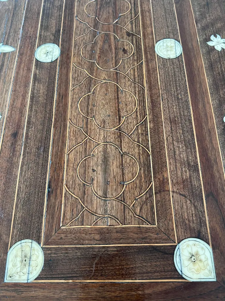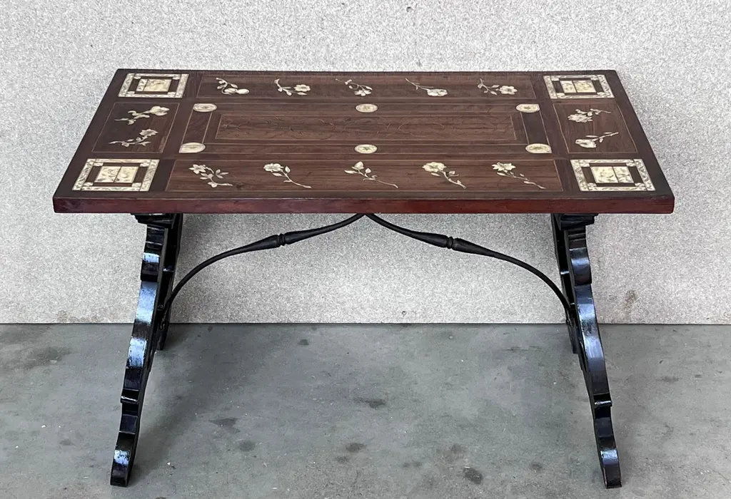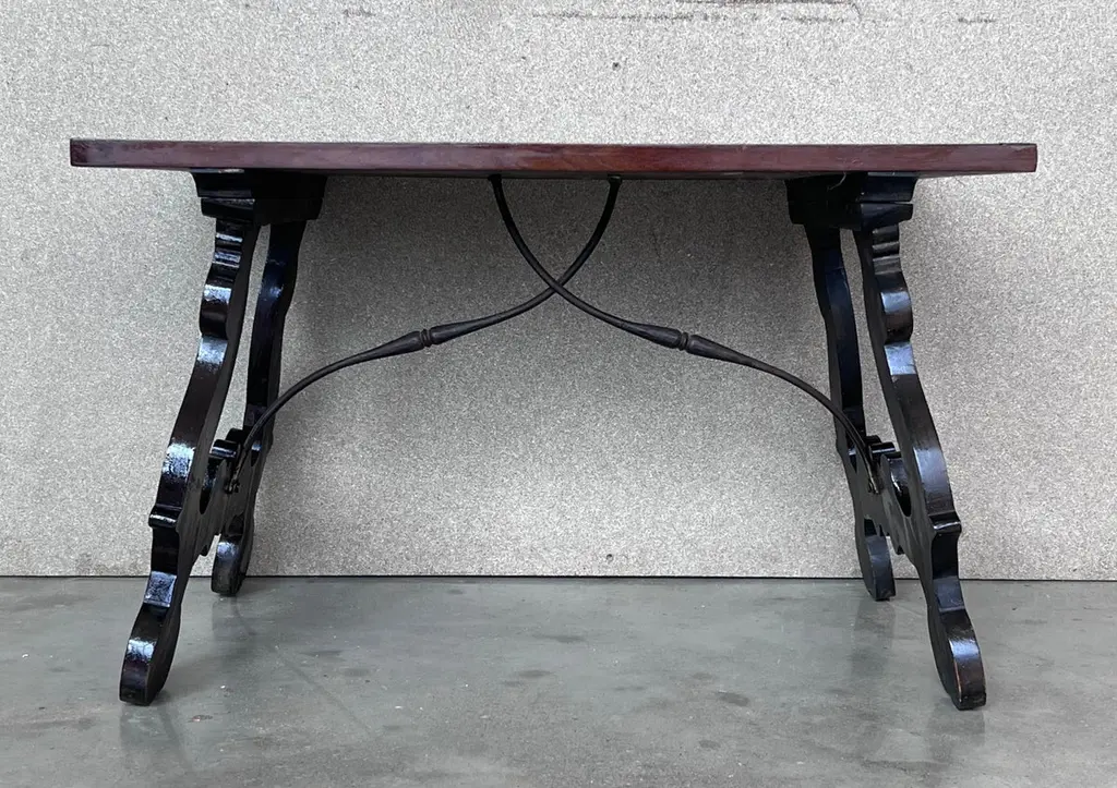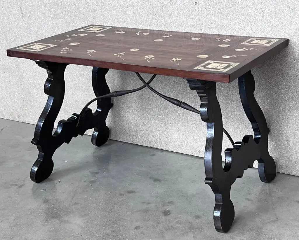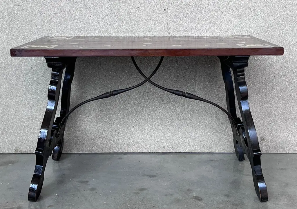 19th Century Baroque Spanish side table with marquetry top and iron stretcher19th century Spanish trestle table in walnut. This piece has a great scale, lovely turned legs and beautiful marquetry top. This table could be used as an end table, nightstand, side table, or small desk.Perfectly restored.
