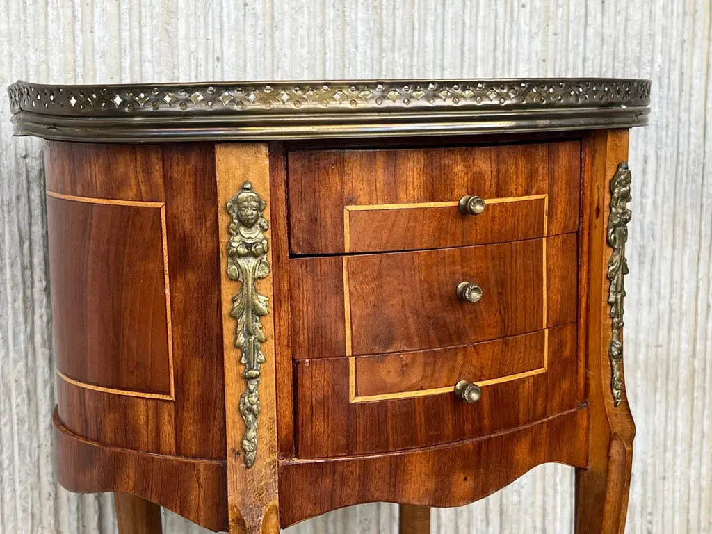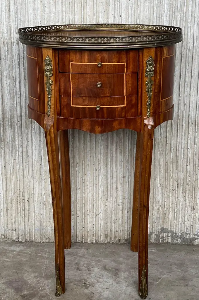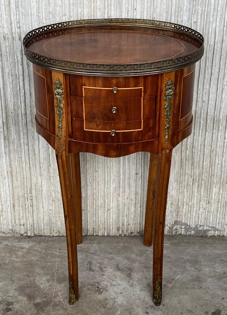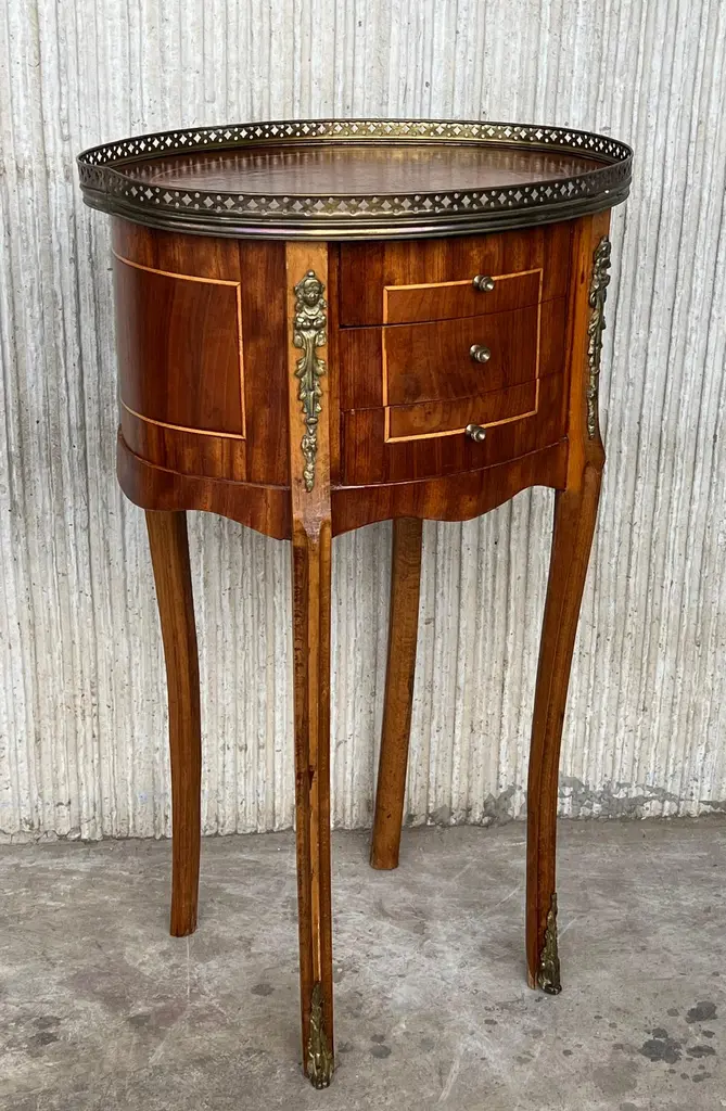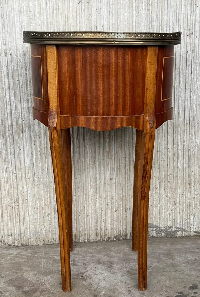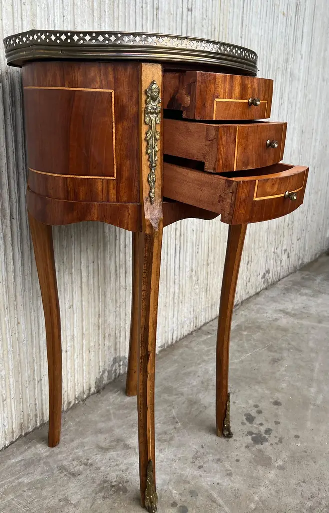 French Louis XVI style side table or nightstand topped with marquetry top, fluted legs finished with golden bronze clogs. Three dovetailed small drawers with brass details.