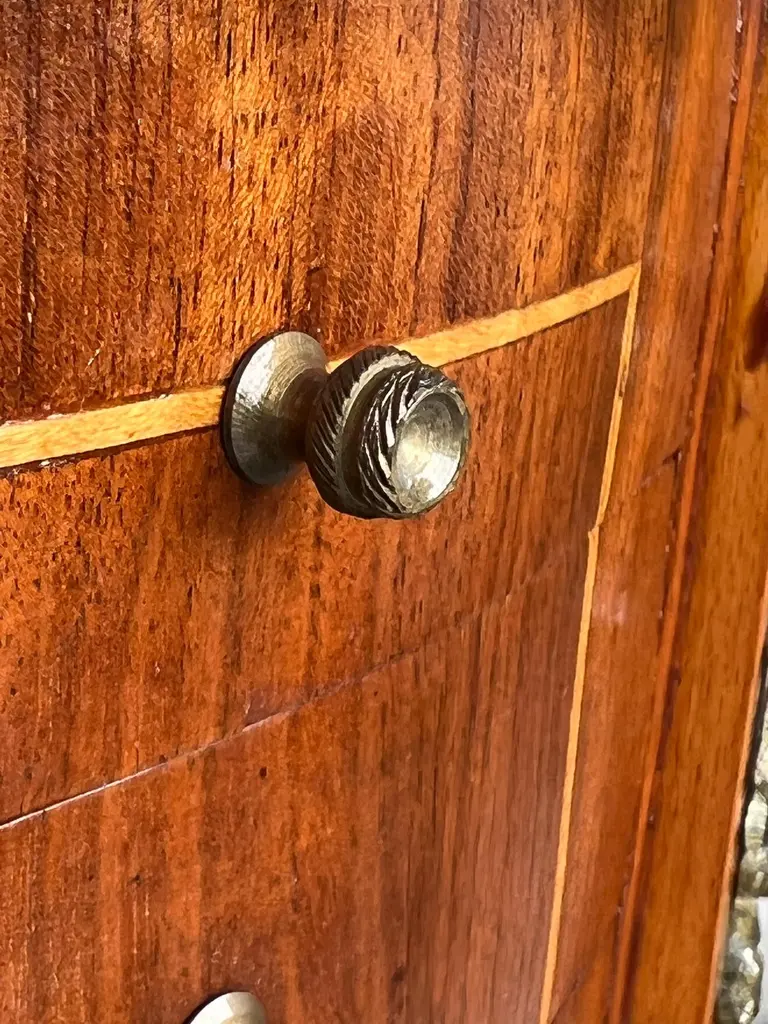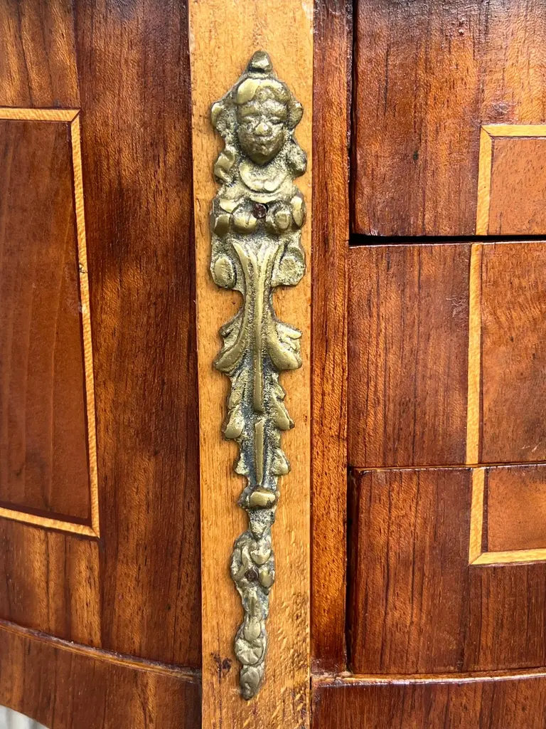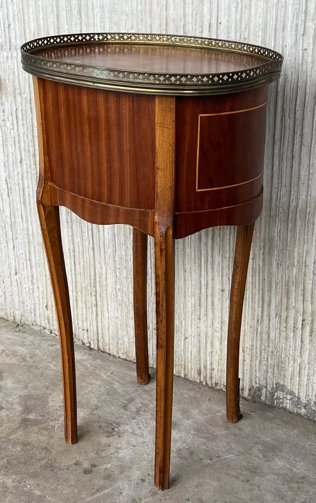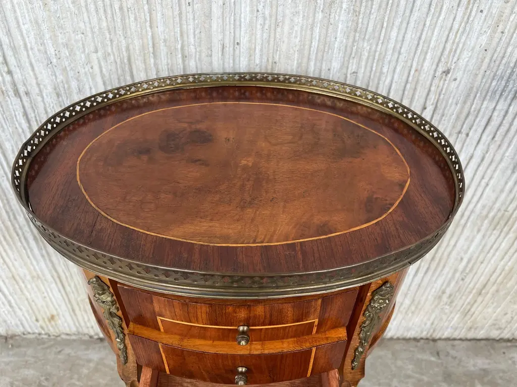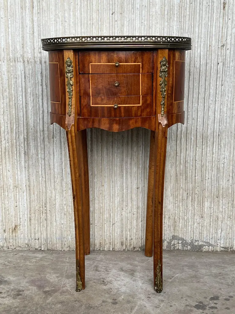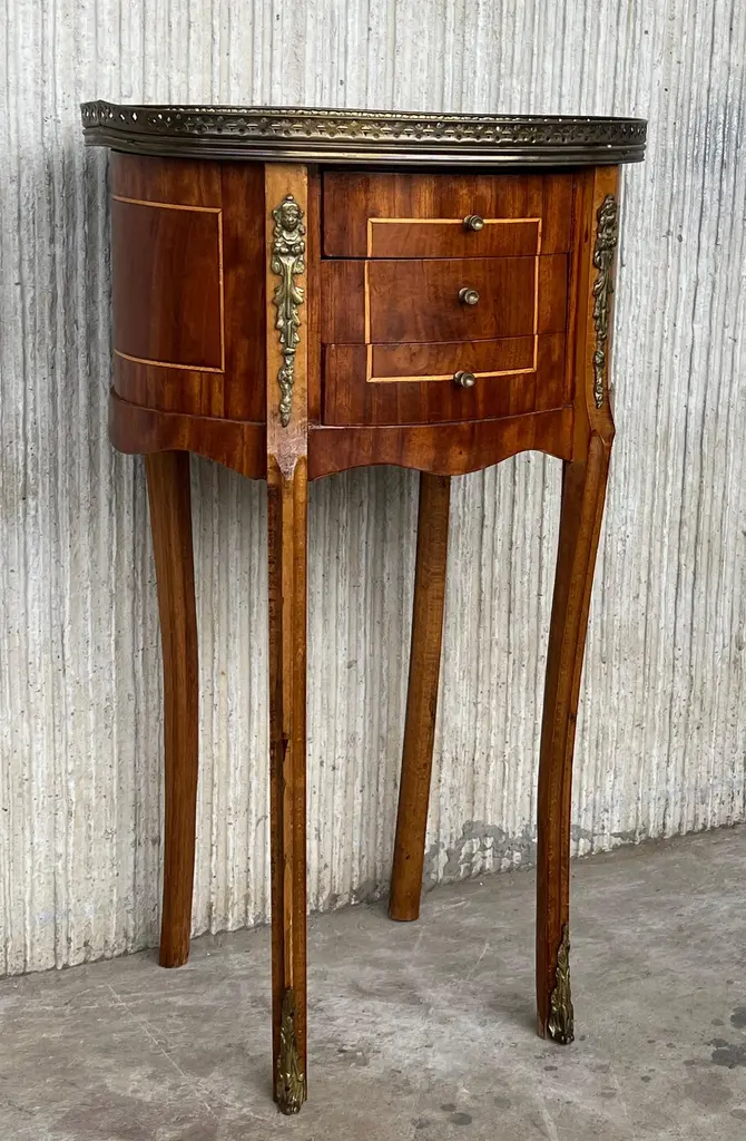 French Louis XVI style side table or nightstand topped with marquetry top, fluted legs finished with golden bronze clogs. Three dovetailed small drawers with brass details.