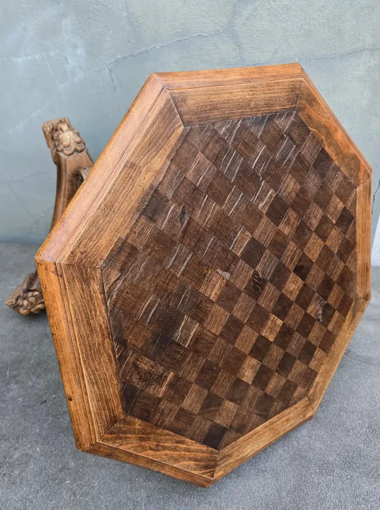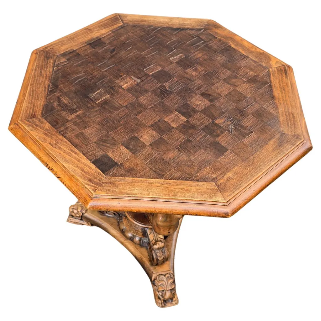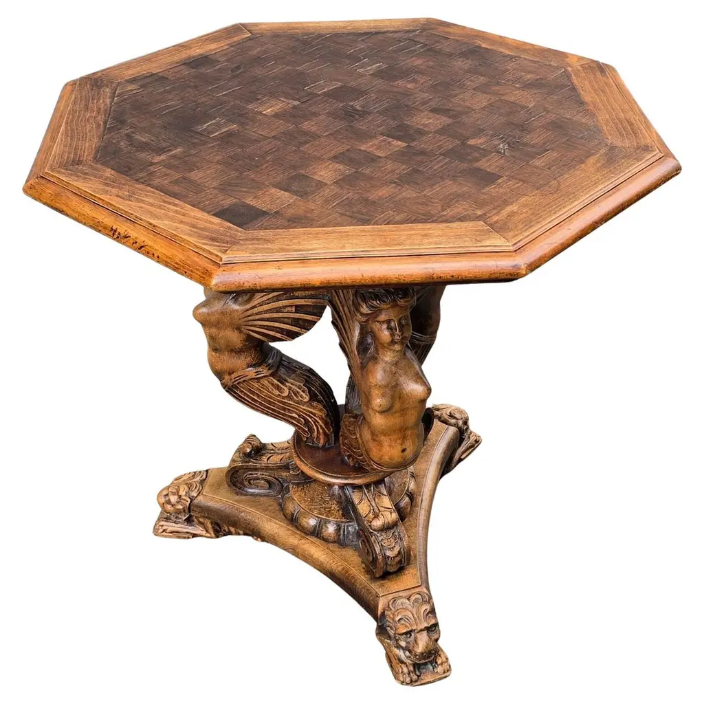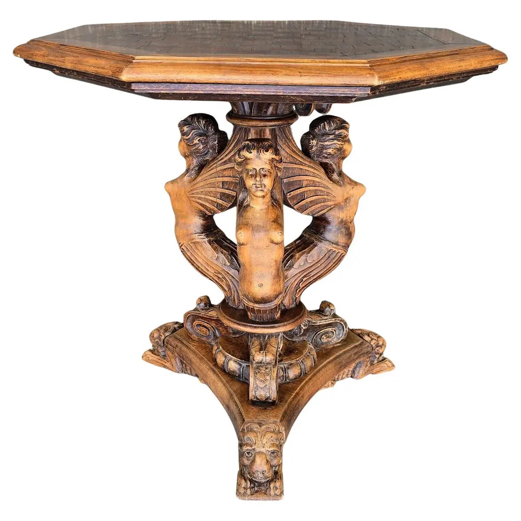 19th Century Italian Table with Carved Female Sphinxes and Lions – Octagonal TopA highly detailed hand-carved table from Italy, circa 1850–1880. This rare piece blends mythological iconography with masterful woodwork.The base features three female sphinxes — mythical creatures with a woman’s head and bust seamlessly merging into lion bodies. Their hair, faces, and feline limbs are beautifully sculpted with remarkable precision. Beneath them sit three fully carved lions, each rendered in the round with manes, paws, and expressive features.The octagonal tabletop is decorated with a fine checkerboard inlay of warm-toned wood veneer squares, framed by a shaped edge.Note: the top shows visible signs of wear, scratches, and some surface damage (see photos), consistent with age and use.Dimensions:Height: 74 cm (29 inches)Diameter: 70 cm (27.5 inches)Origin: ItalyPeriod: Mid to late 19th centuryMaterial: Solid carved walnutStyle: Neorenaissance / EclecticCondition:Structurally solidOriginal patina retainedSurface wear and marks on the top due to ageA rare statement piece for collectors of mythological design, fine European furniture, or neoclassical sculpture. Ideal as a center or accent table.
